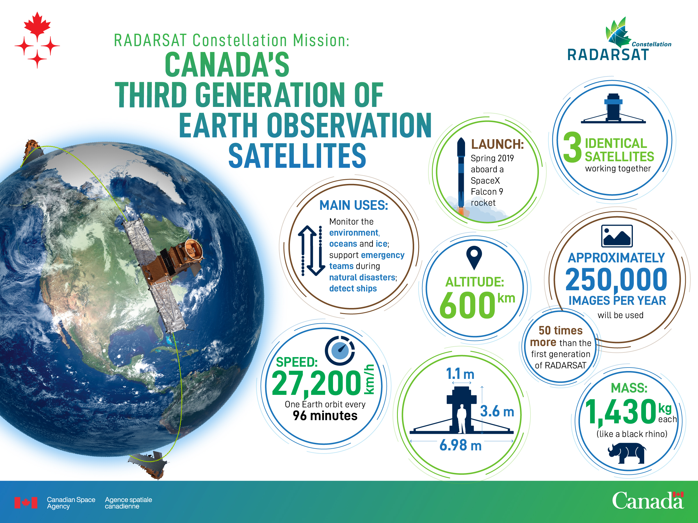 This infographic presents information about the RADARSAT Constellation Mission. It features an image of Earth with three satellites orbiting it.