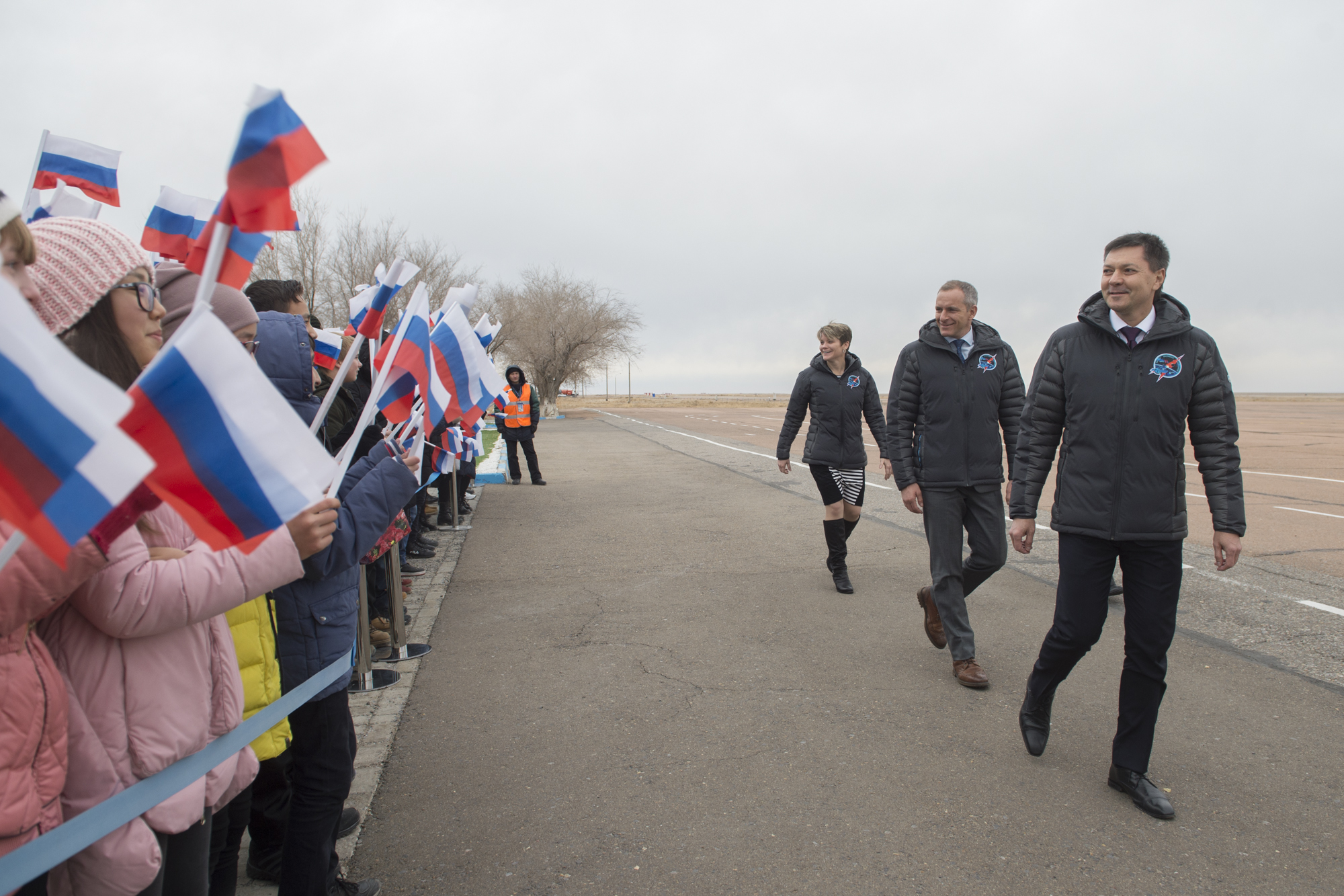 The prime crew and the backup crew are greeted by Russian space officials in Baikonur, Kazakhstan. (Credit: Gagarin Cosmonaut Training Center (GCTC))