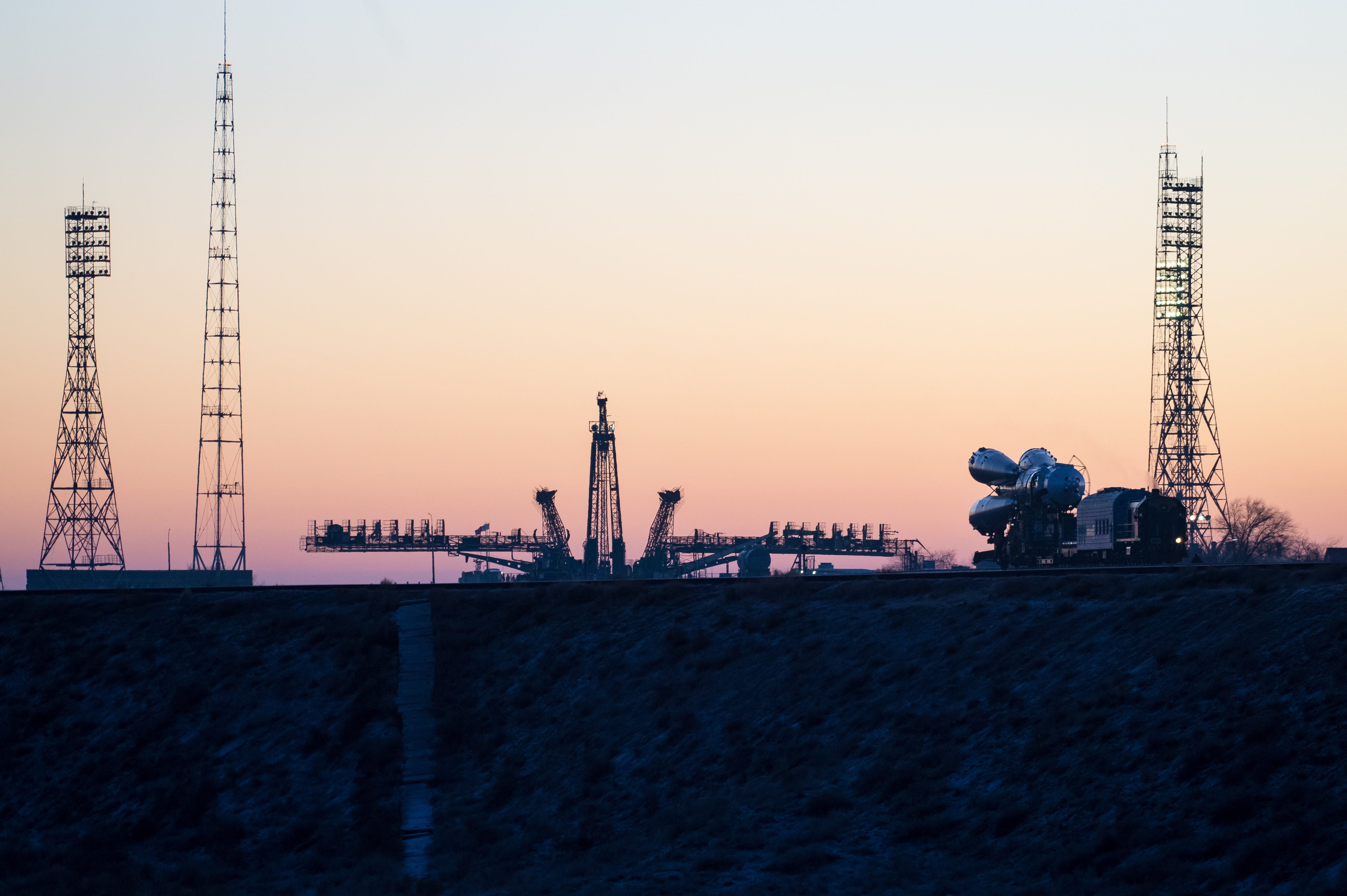 2018-12-01 – In preparation for the December 3 launch, the Soyuz spacecraft is rolled out to the launch pad at the Baikonur Cosmodrome where it is raised into a vertical position.