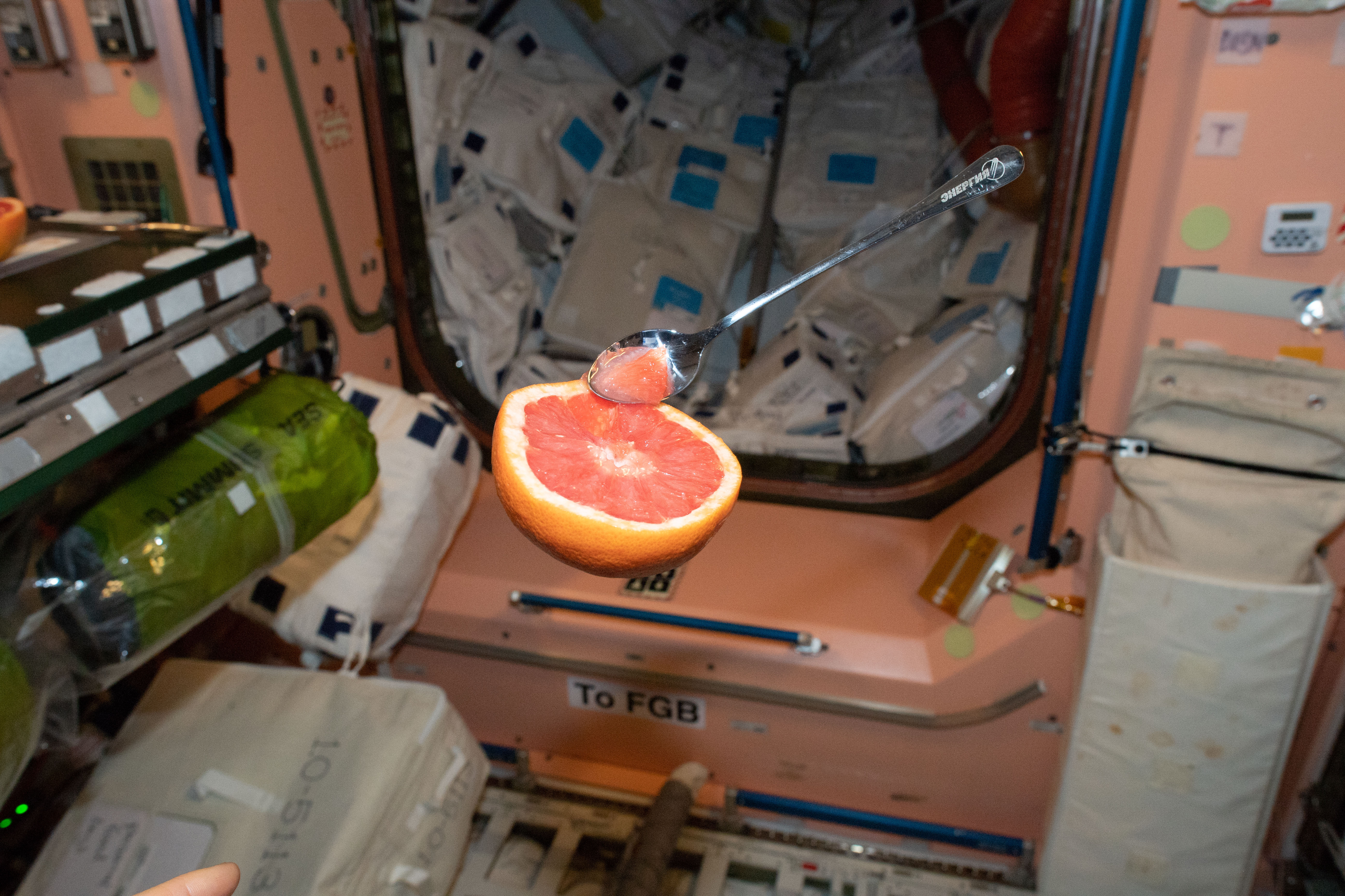 2019-01-08 - Canadian astronaut David Saint-Jacques enjoys a grapefruit, a rare treat in orbit! (Credit: CSA/NASA)