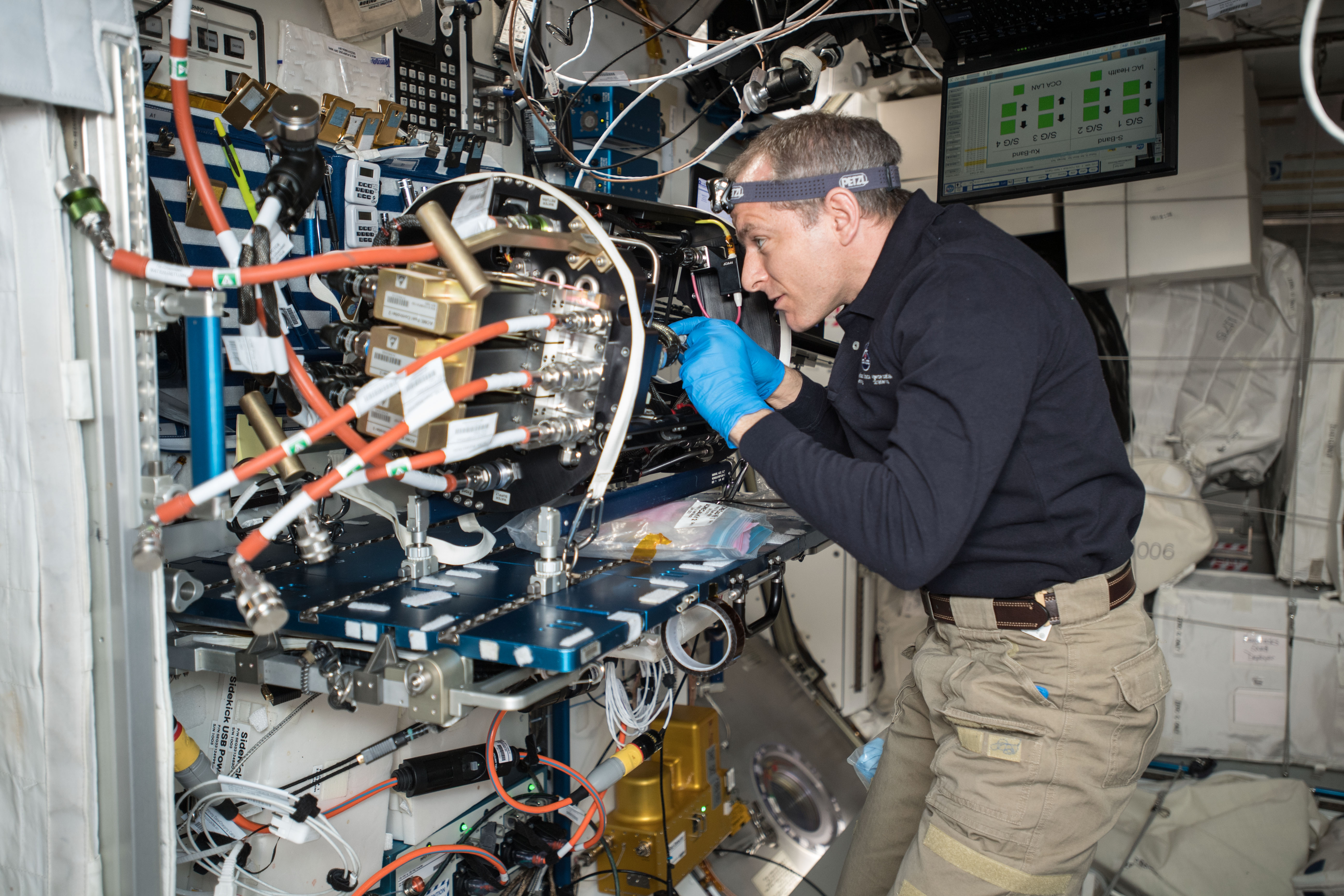2019-01-31 - CSA astronaut David Saint-Jacques is doing maintenance on the Combustion Integrated Rack. He is swapping optical components on the material research facility. (Credit: CSA/NASA)
