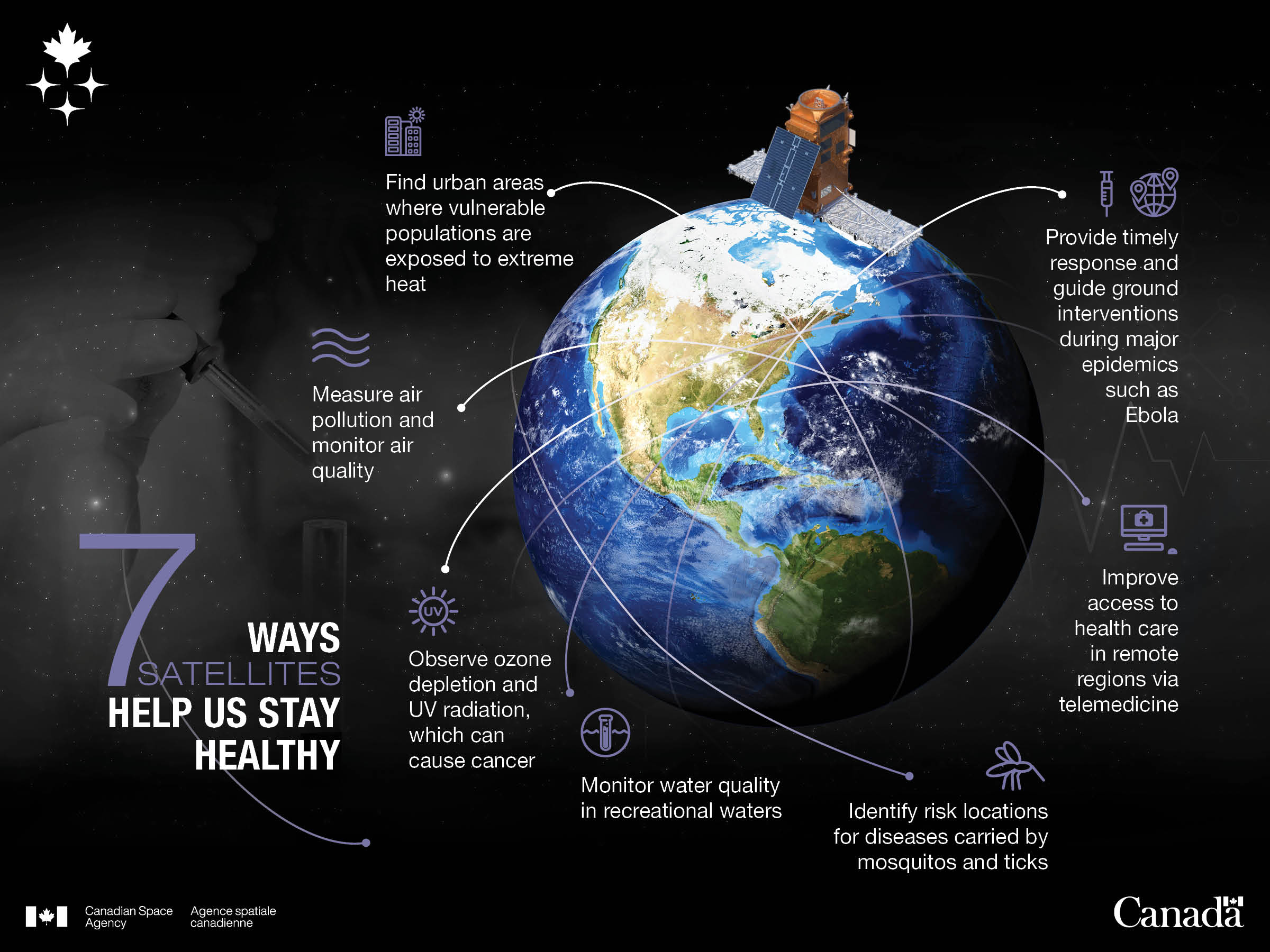 Did you know satellites help keep us healthy? From measuring air pollution and monitoring air quality to identifying risk locations for diseases carried by mosquitos and ticks, here are just 7 of the many ways satellites contribute to our health. (Credit: Canadian Space Agency)