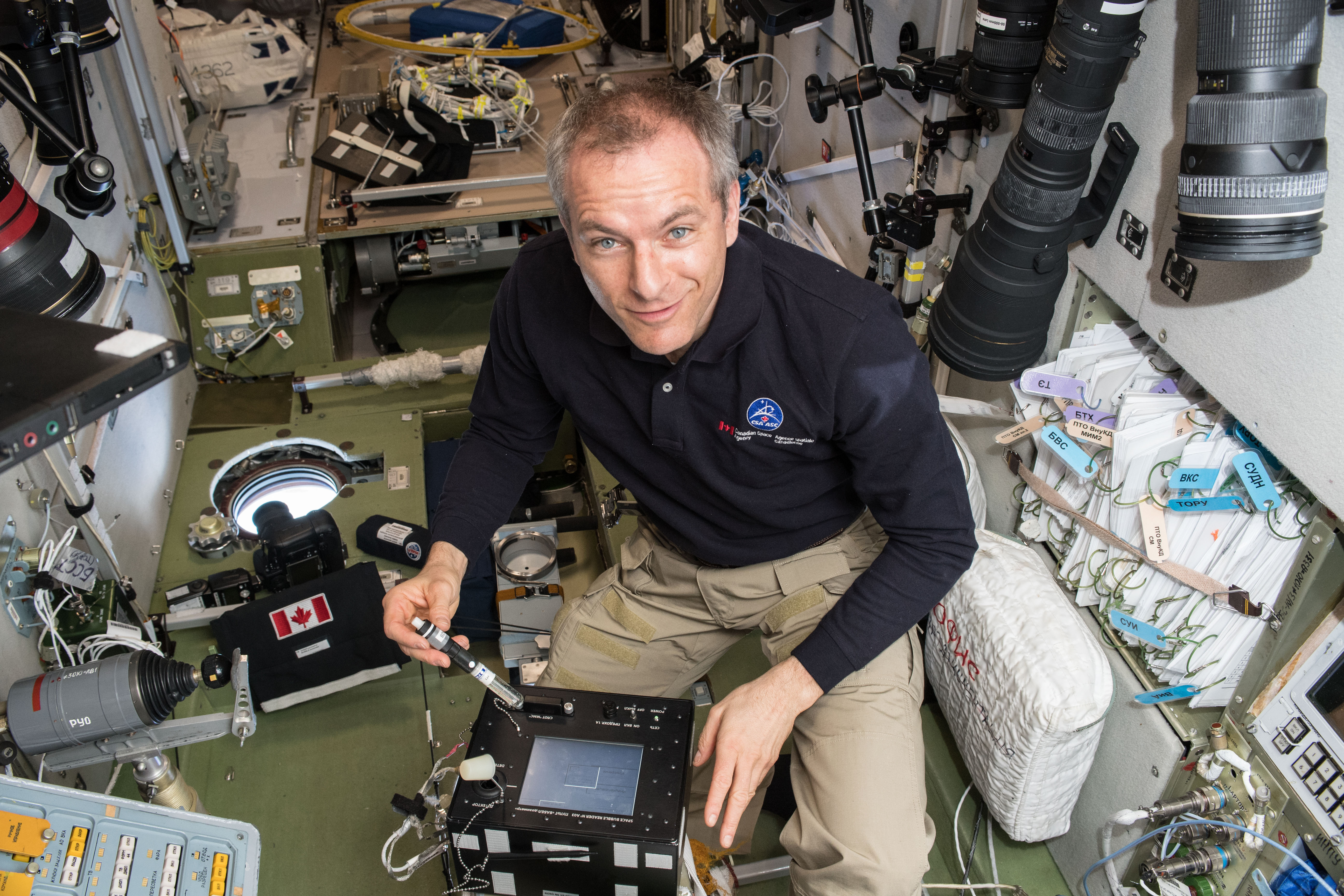 2019-02-26 - CSA astronaut David Saint-Jacques is placing finger-sized tubes of polymer gel, known as bubble monitors, around the International Space Station for the Radi-N2 study. This Canadian space research could help reduce radiation risks for future space travellers. (Credit: CSA/NASA)