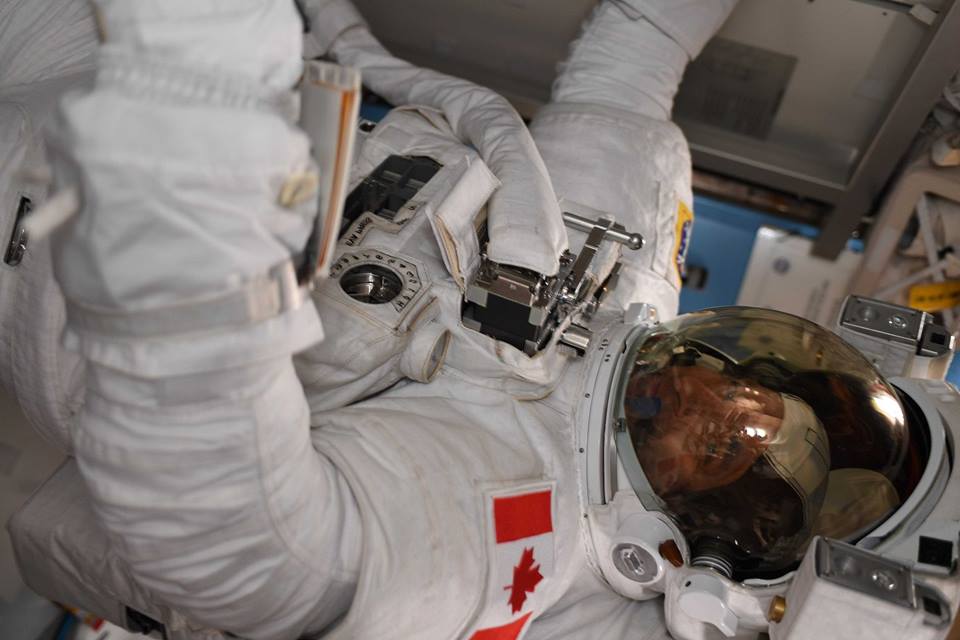 2019-03-04 - CSA astronaut is trying on his spacesuit to adjust for space growth. (Credit: CSA/NASA)