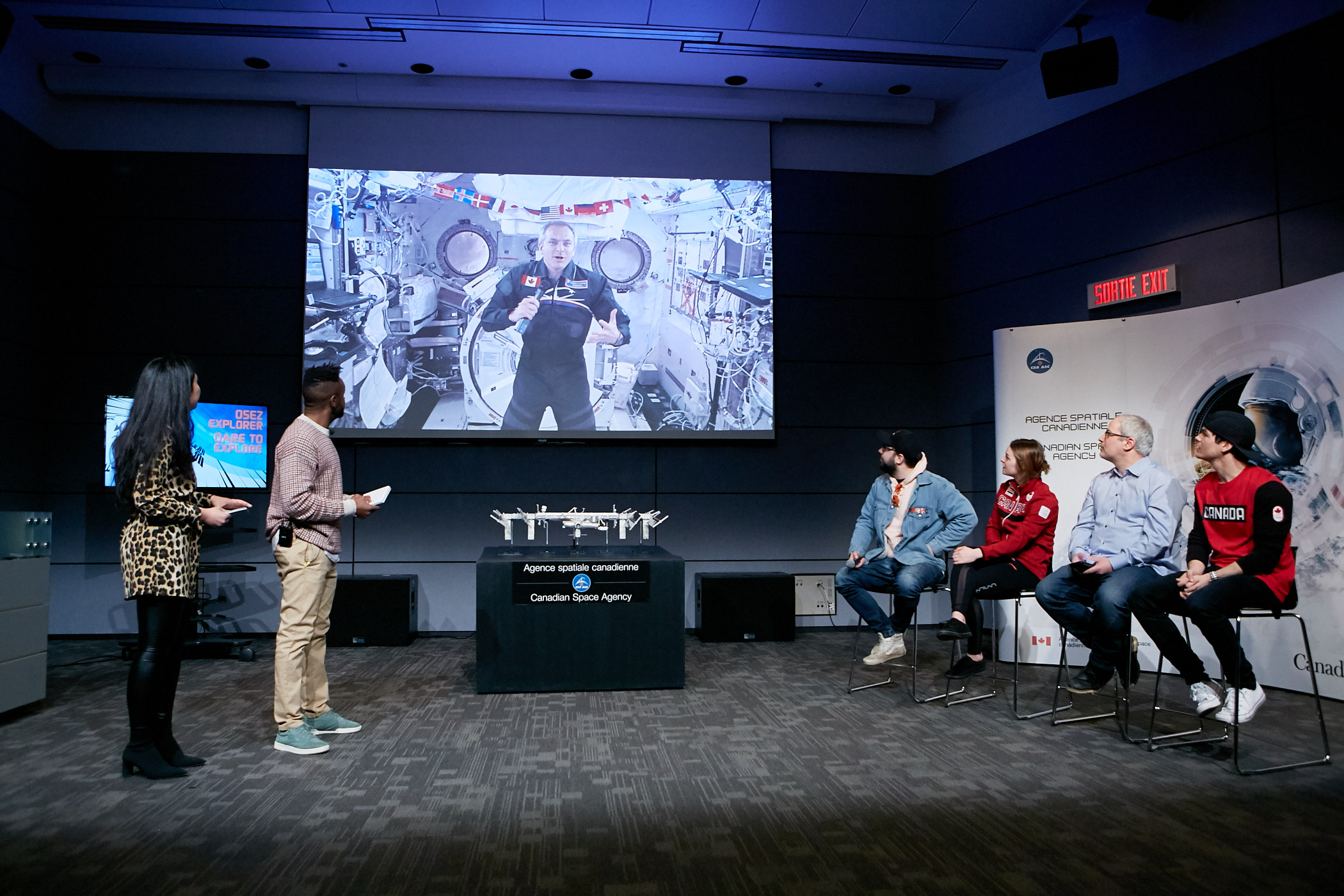 TV host Pierre-Yves Lord, science communicator Samantha Yammine, YouTuber Frédéric Bastien, athletes Kim Boutin and Mikaël Kingsbury, and scientific Martin Cali participate in the event. (Credit: Canadian Space Agency)