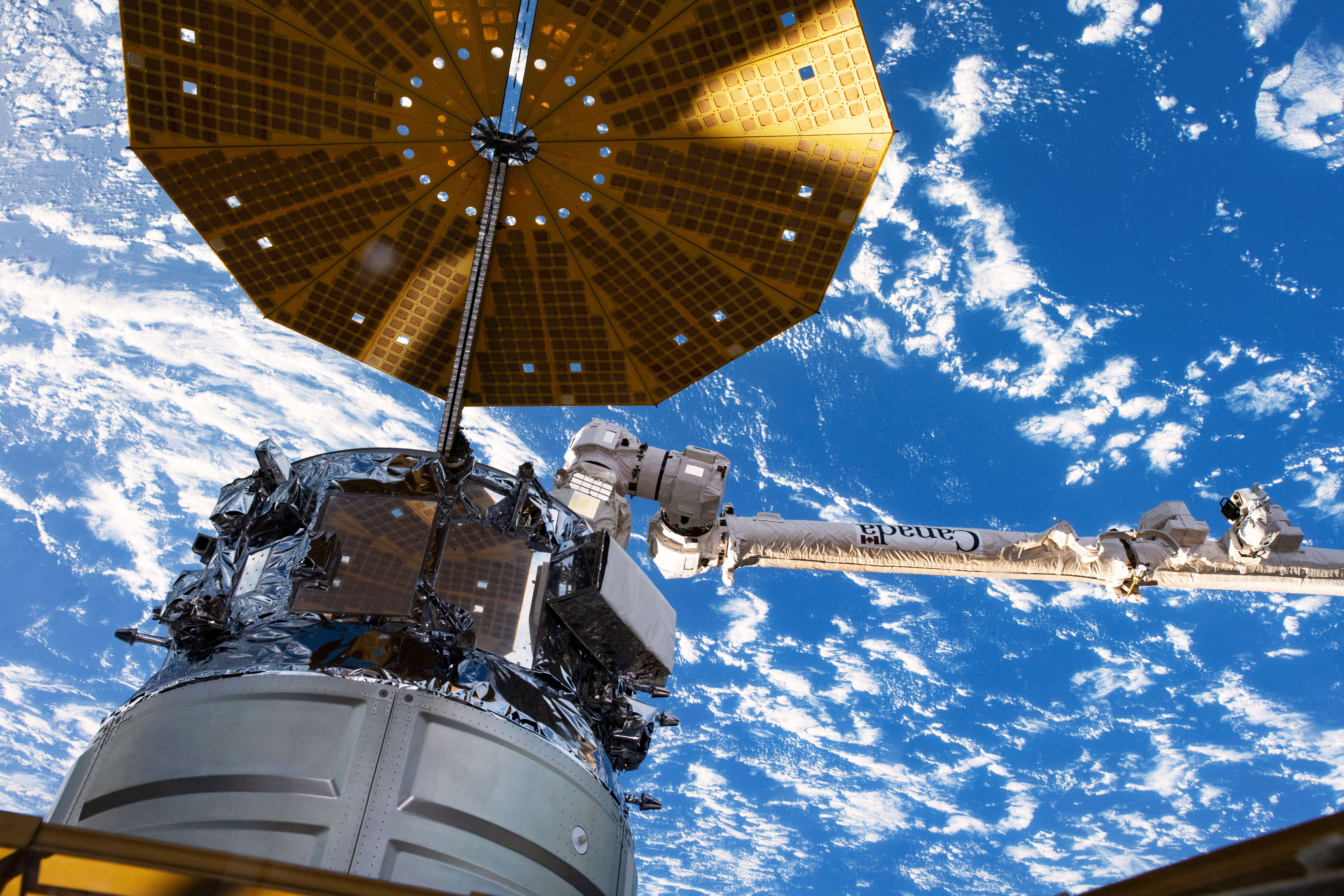 2019-04-02 - Canadarm2, the International Space Station's robotic arm, photographed over the Pacific Coast by CSA astronaut David Saint-Jacques. (Credit: CSA/NASA)