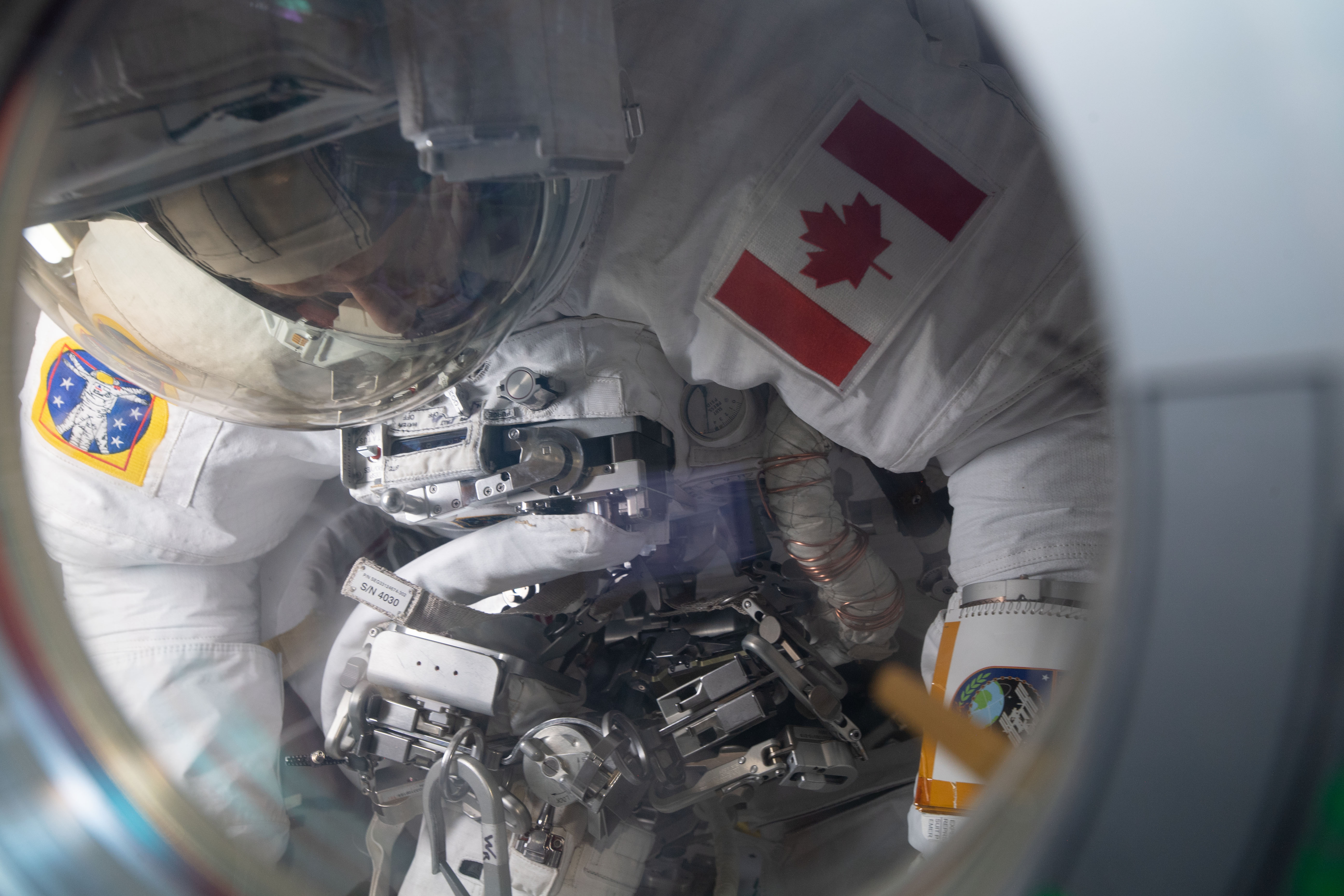 2019-04-08 - Canadian Space Agency astronaut David Saint-Jacques conducts his first spacewalk with NASA astronaut Anne McClain. (Credit: CSA/NASA)