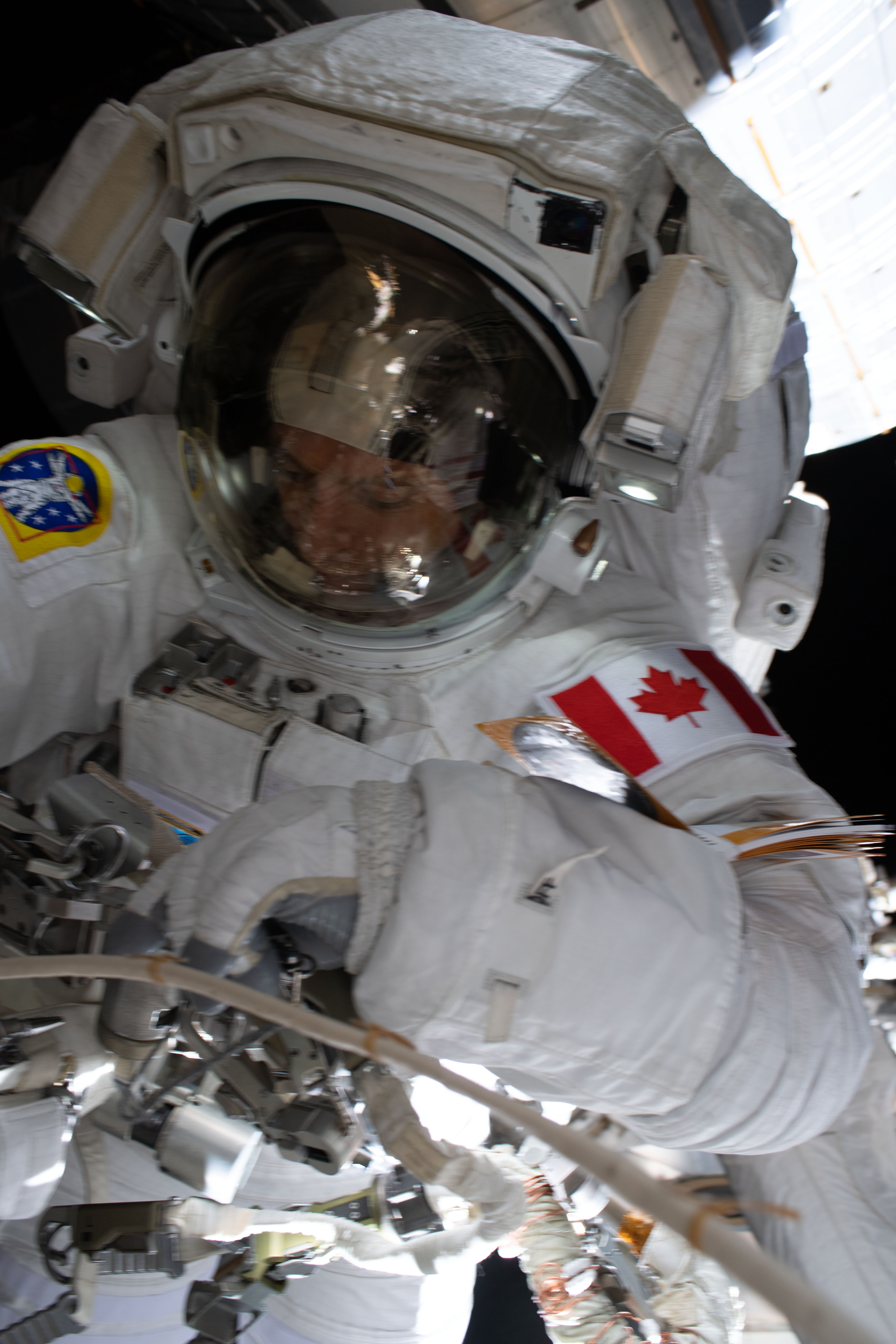 2019-04-08 - Canadian Space Agency astronaut David Saint-Jacques conducts his first spacewalk with NASA astronaut Anne McClain. (Credit: CSA/NASA)