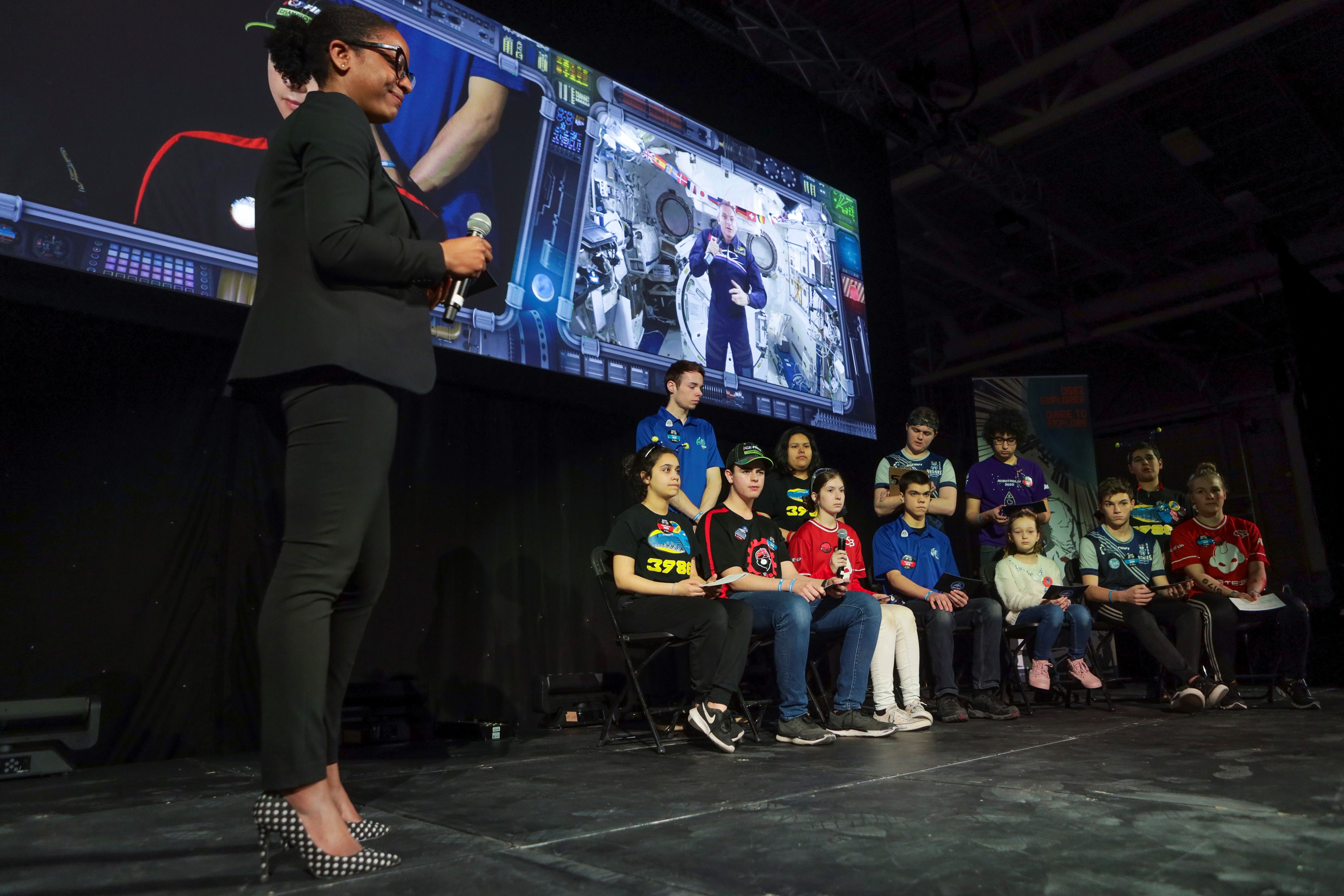 2019-04-05 - Canadian Space Agency astronaut David Saint-Jacques answers questions from youth participating in the Robotique FIRST Québec Festival during a live connection with the International Space Station. (Credit: Canadian Space Agency)