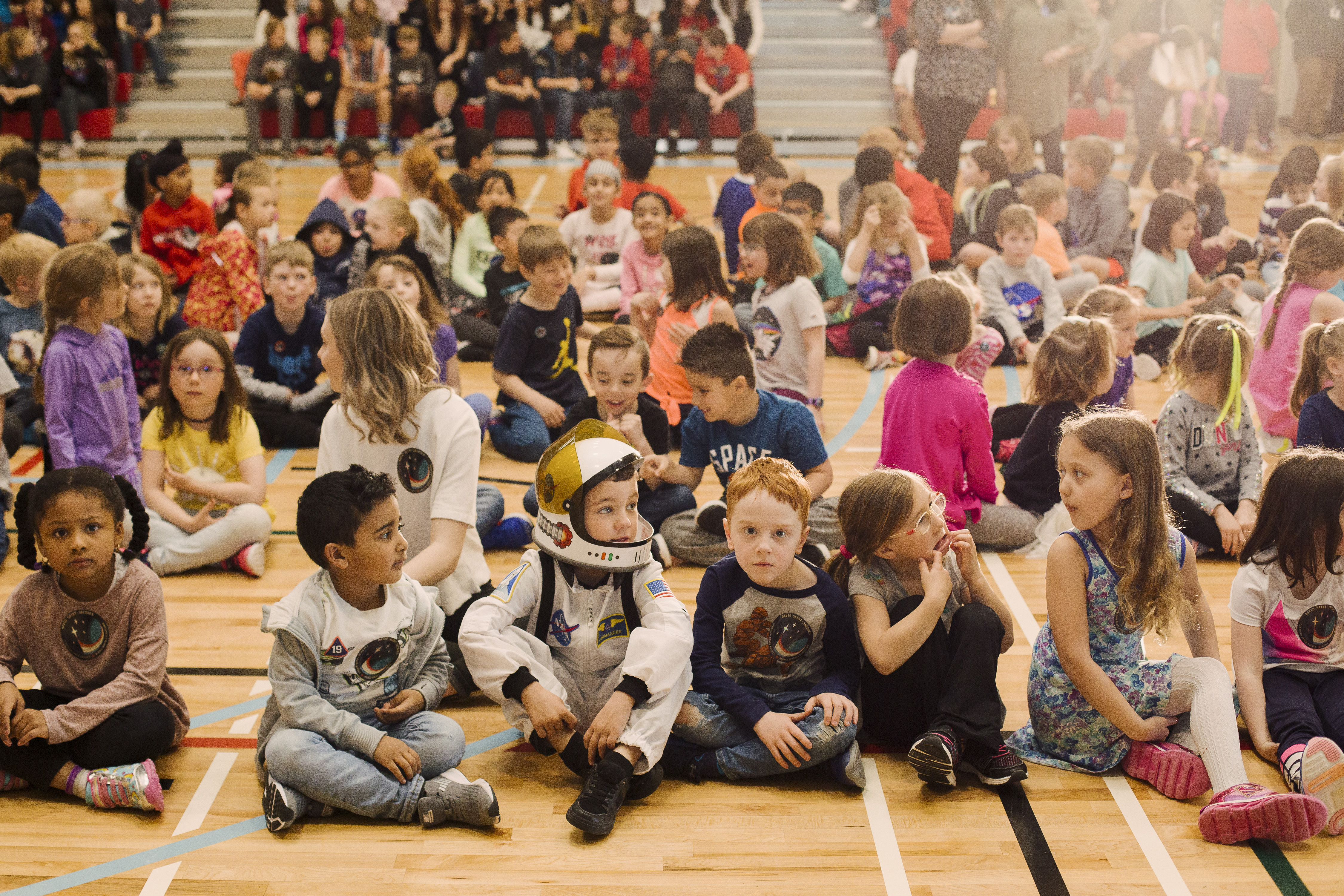 2019-04-17 - Canadian Space Agency astronaut David Saint-Jacques connects with a group of students who participated in the Living Space project, at École Champs Vallée School, in Beaumont, Alberta. The students shared the results of their research project with David and then had the chance to ask him questions about his experience in space. (Credit: Canadian Space Agency)