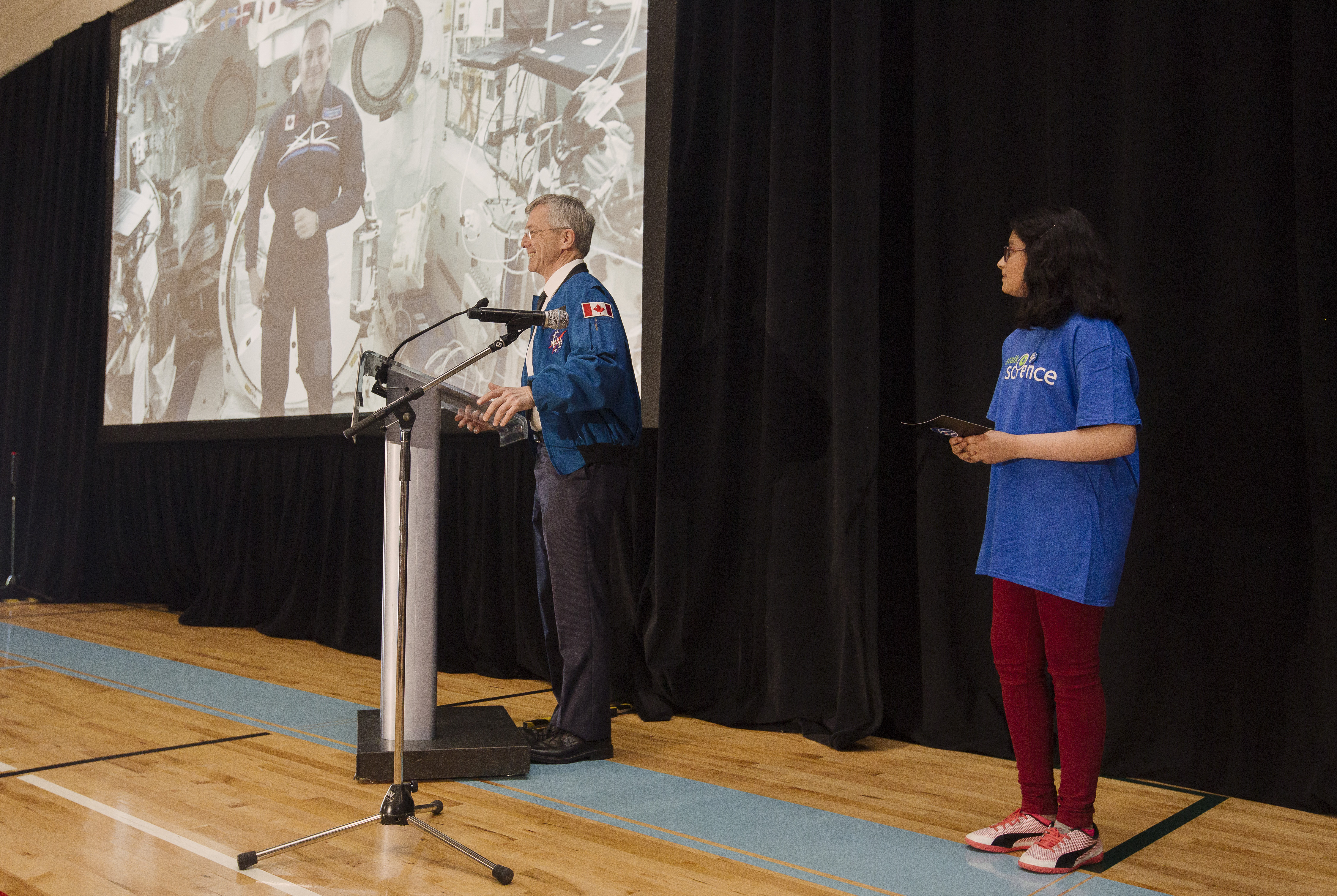 David Saint-Jacques speaks to students in Alberta about their Living Space project results