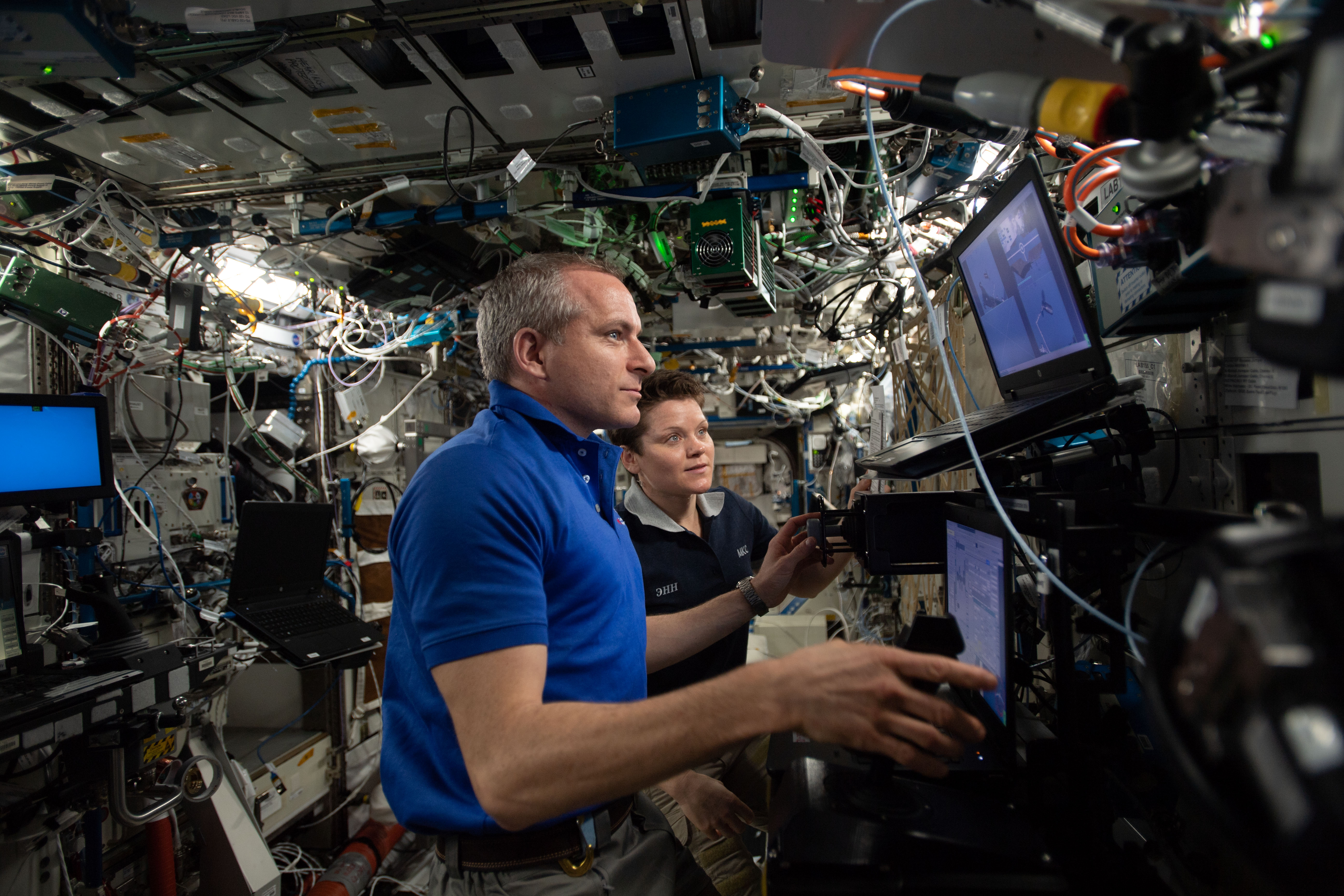 2019-04-16 - CSA astronaut David Saint-Jacques and NASA astronaut Anne McClain are practising using Canadarm2 ahead of the upcoming cargo of the Northrop Grumman's Cygnus resupply ship, on April 19, 2019. (Credit: CSA/NASA)