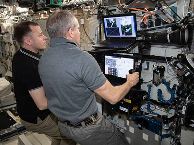 2019-04-24 – CSA astronaut David Saint-Jacques and NASA astronaut Nick Hague are practising using Canadarm2 ahead of the upcoming SpaceX's Dragon cargo ship. (Credit: NASA)
