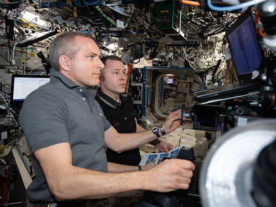 2019-04-24 – CSA astronaut David Saint-Jacques and NASA astronaut Nick Hague are practising using Canadarm2 ahead of the upcoming SpaceX's Dragon cargo ship. (Credit: NASA)