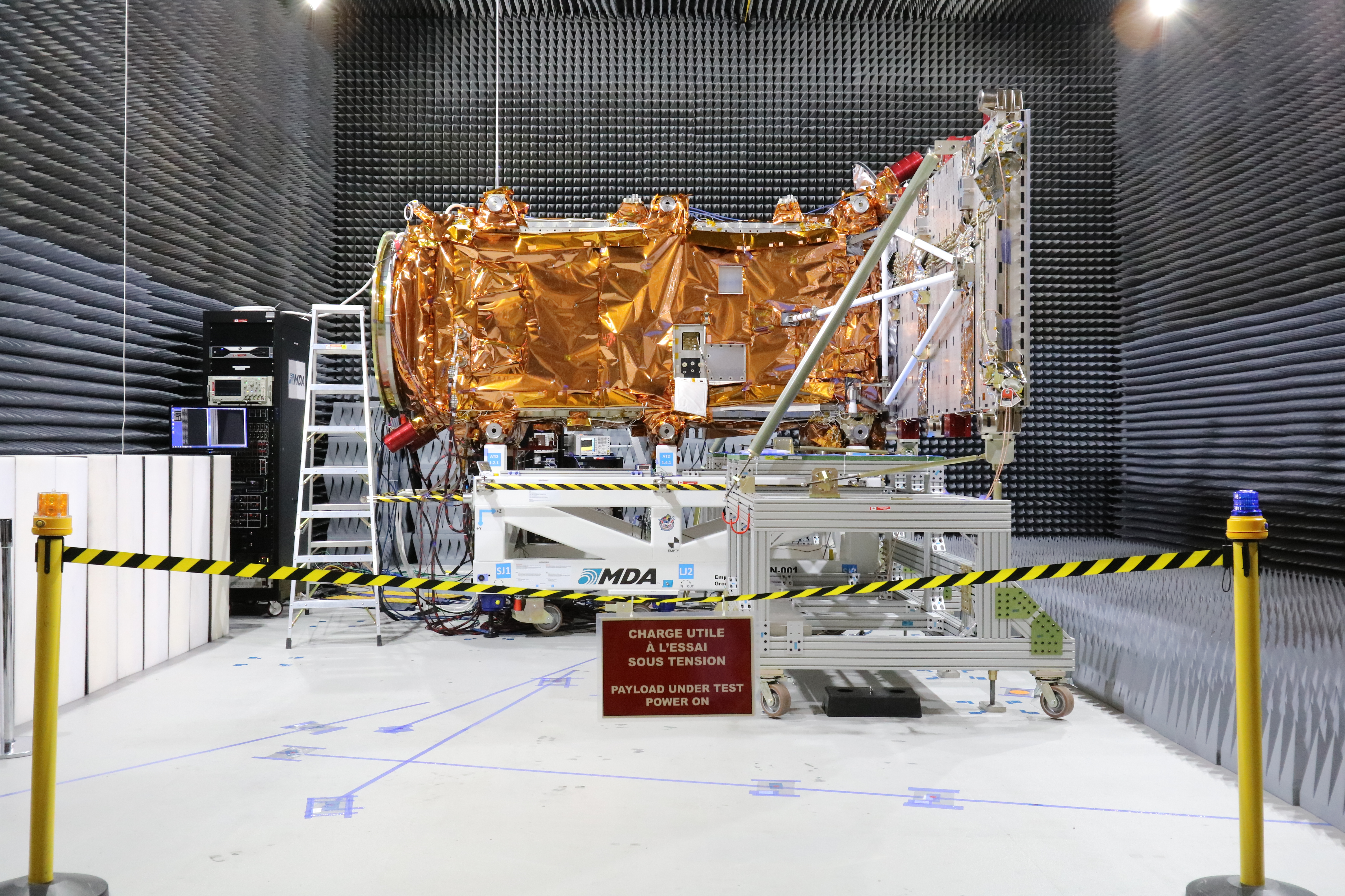 2018-01-24 – One of the RCM spacecraft with its antenna fully deployed during tests in MDA’s anechoic chamber in the Montreal area. The RADARSAT Constellation is Canada’s new generation of Earth observation satellites. The three identical satellites work together to bring solutions to key challenges for Canadians. (Credit: Canadian Space Agency)