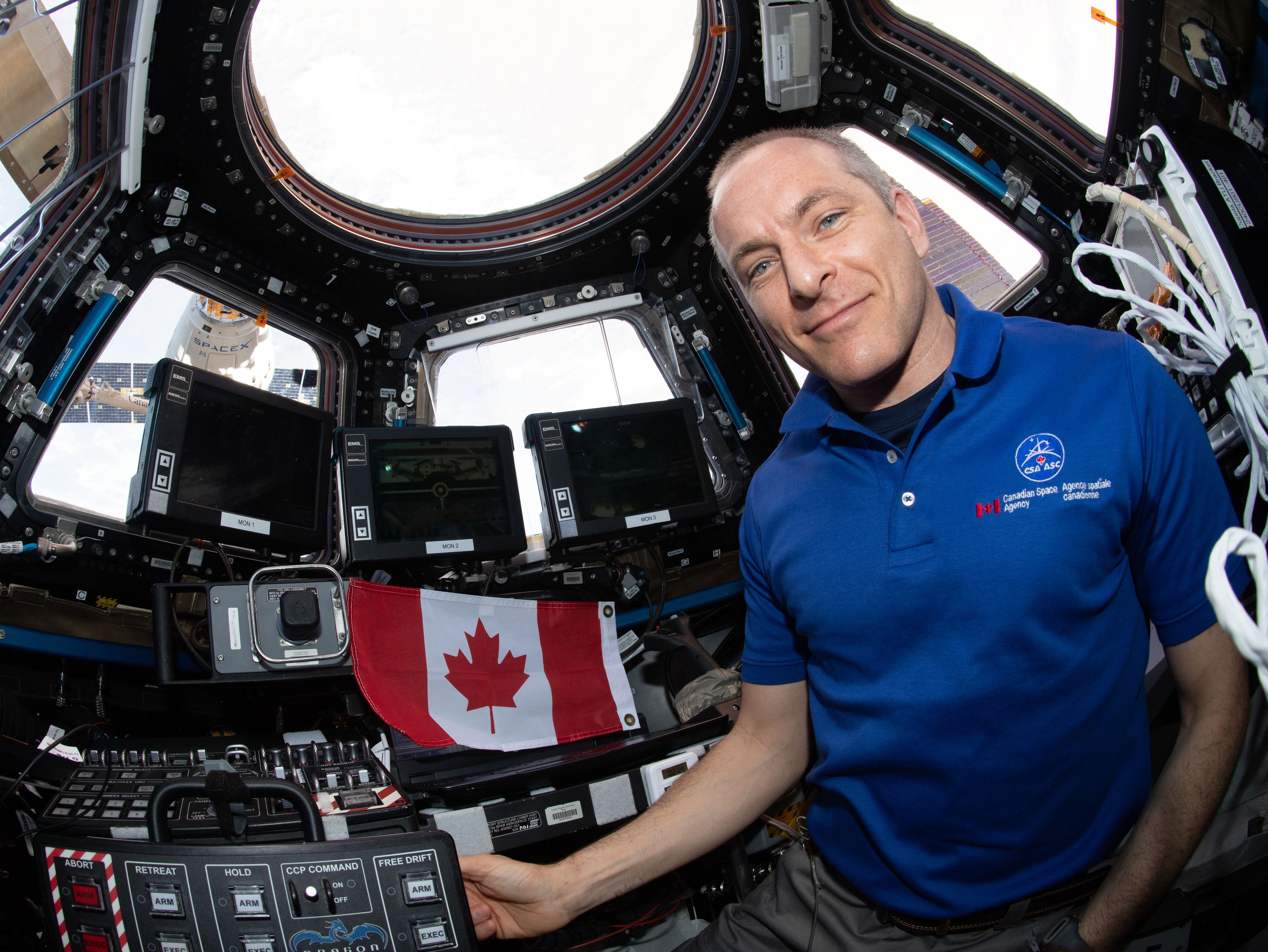 2019-05-06 – CSA astronaut David Saint-Jacques takes a selfie in the Cupola of the ISS, after using Canadarm2 to capture SpaceX's Dragon cargo ship. (Credit: CSA/NASA)