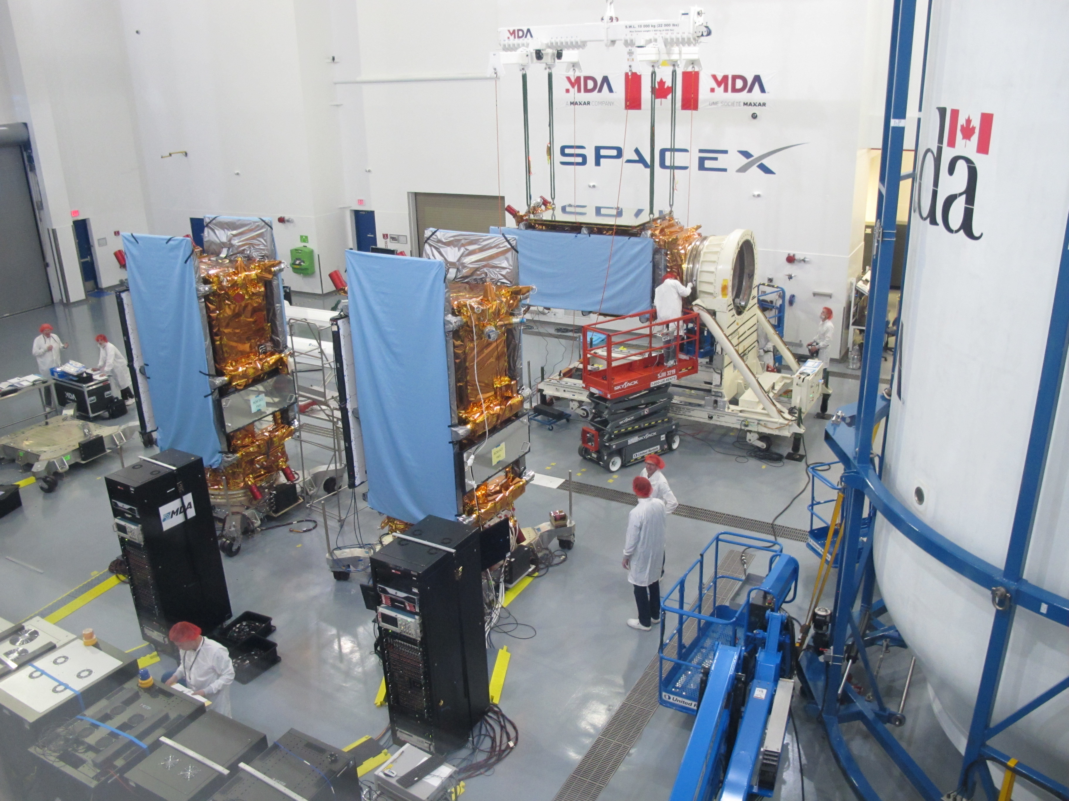 2019-04-30 - The three RADARSAT Constellation Mission (RCM) satellites are being prepared for their launch aboard a Falcon 9 rocket at the SpaceX facilities at the Vandenberg Air Force Base. (Credits: Canadian Space Agency, MDA, a Maxar company)