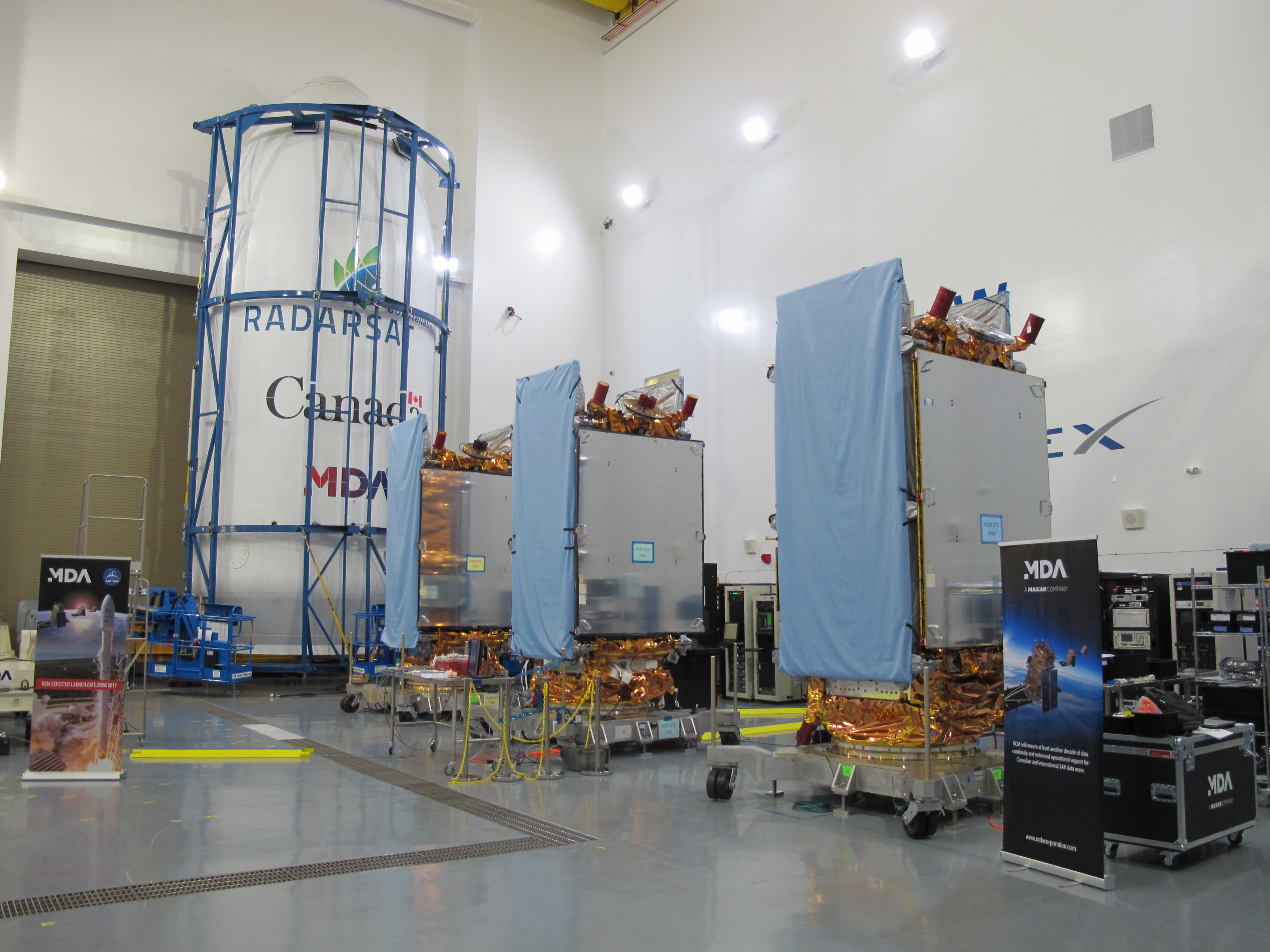 2019-05-01 - The three RADARSAT Constellation Mission (RCM) satellites are being prepared for their launch aboard a Falcon 9 rocket at the SpaceX facilities at the Vandenberg Air Force Base. (Credits: Canadian Space Agency, MDA, a Maxar company)