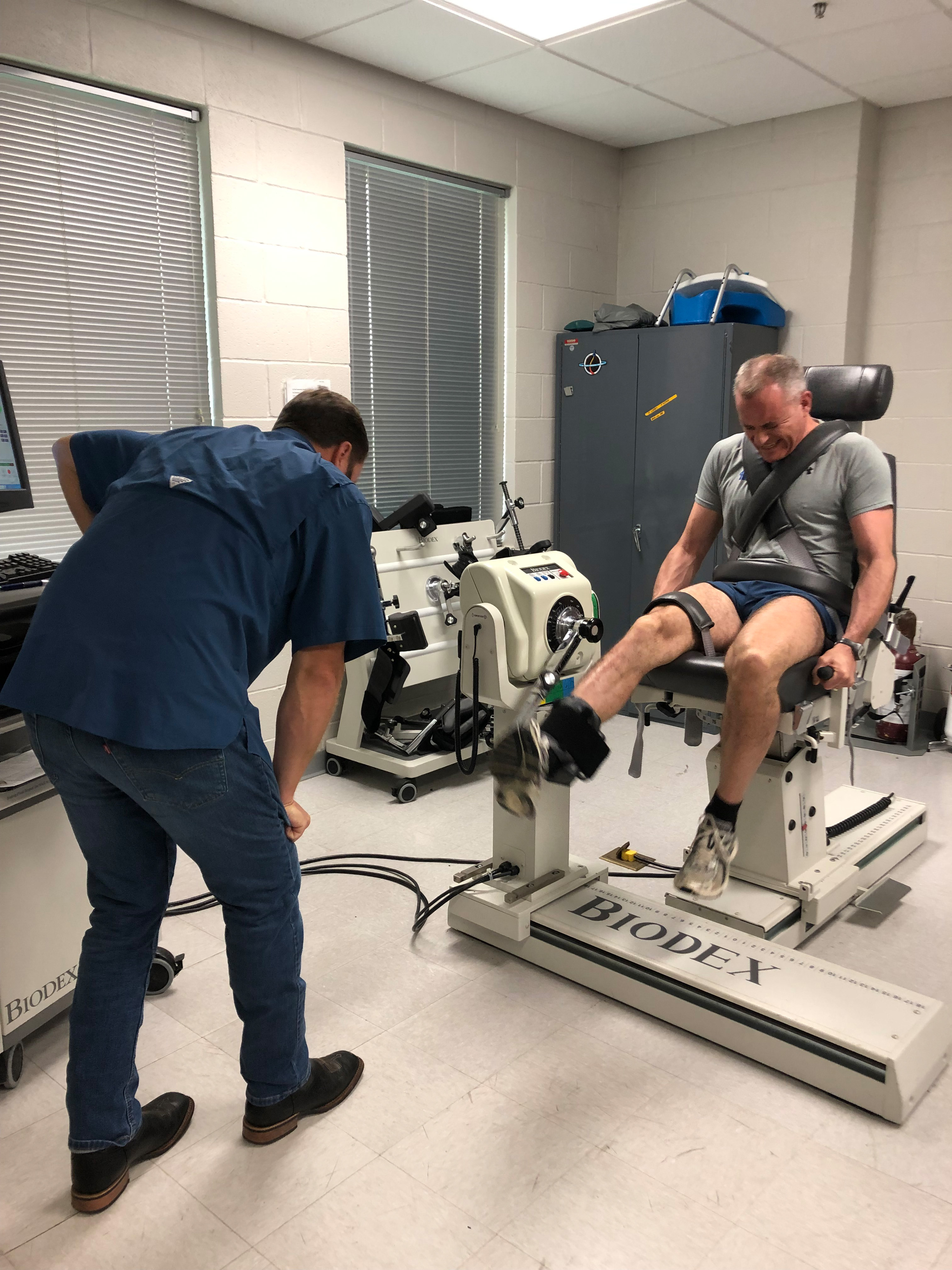 2019-07-01 - After 204 days aboard the International Space Station, Canadian Space Agency astronaut David Saint-Jacques is back in Texas, where he is continuing his post-flight reconditioning program. He does isokinetic testing to assess muscle function. (Credit: Canadian Space Agency)