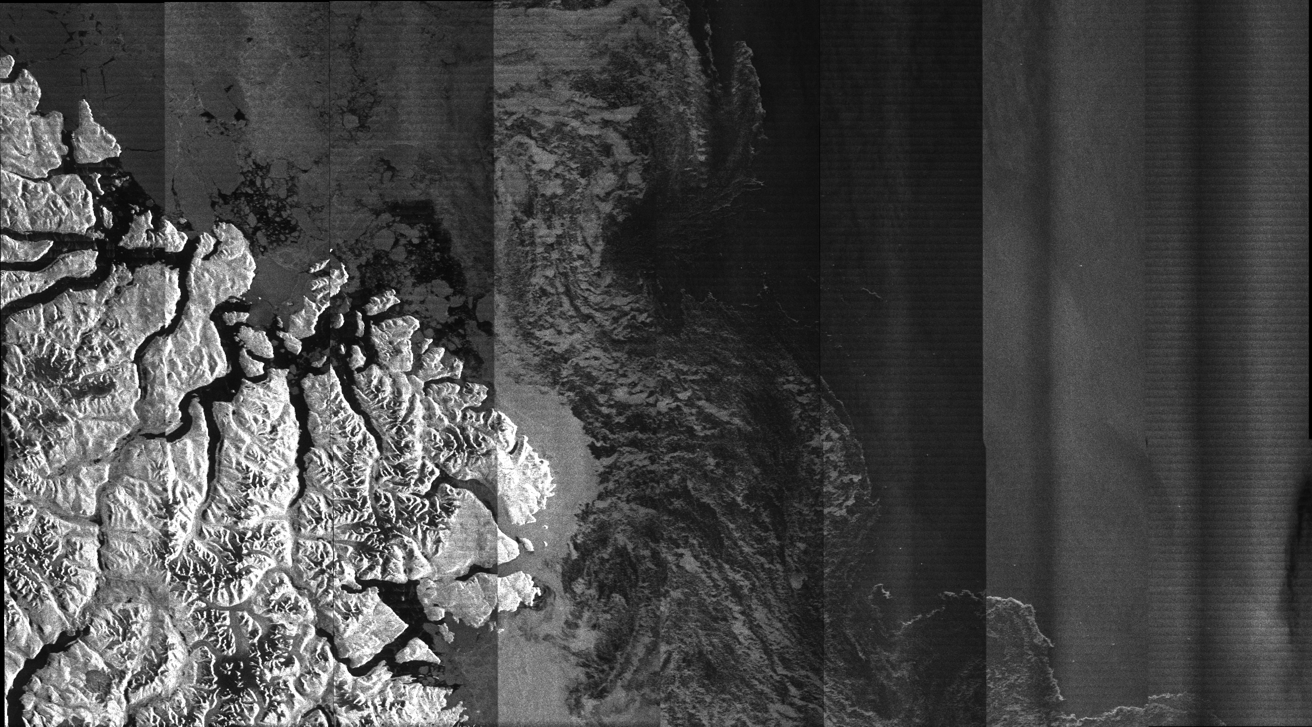 2019-06-29 - One of the RADARSAT Constellation Mission (RCM) satellites captured its very first engineering image of the sea ice in the Strait of Davis and the coast of Baffin Island, Nunavut, including the community of Qikiqtarjuaq, home to about 600 people. This non-calibrated image was acquired on June 29, 2019, at a 100-metre resolution in a low noise ScanSAR mode.