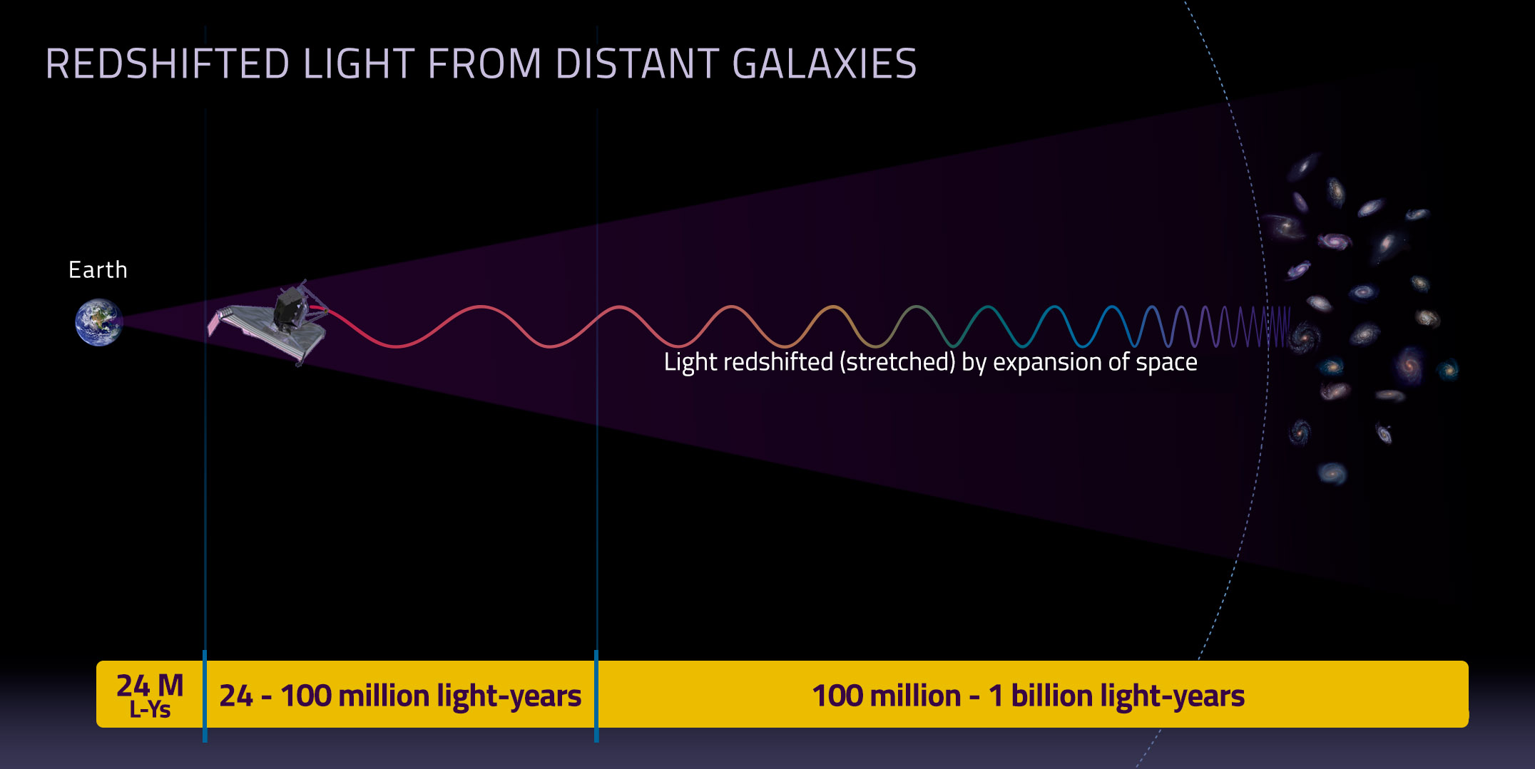 As light travels through our expanding universe, it is stretched into longer wavelengths, meaning that it is moving along the spectrum of light to appear more red. This is known as "redshift." (Credits: Canadian Space Agency, STScI)
