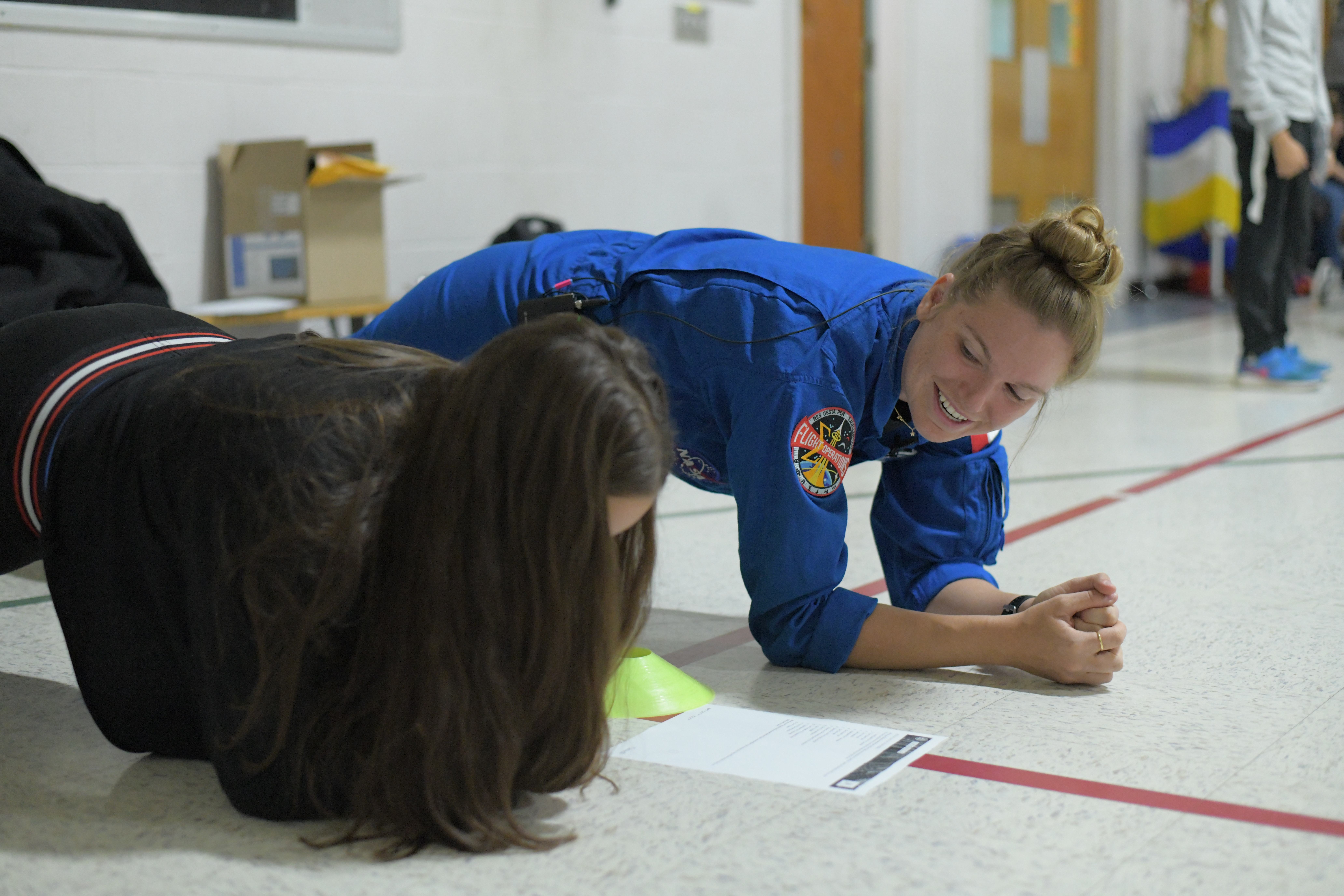 2019-10-30 - Students from Courtland Park International School in Saint-Bruno-de-Montarville, Quebec, participate in the "Lunar rescue" Junior Astronauts fitness activity with astronaut Jenni Sidey-Gibbons.