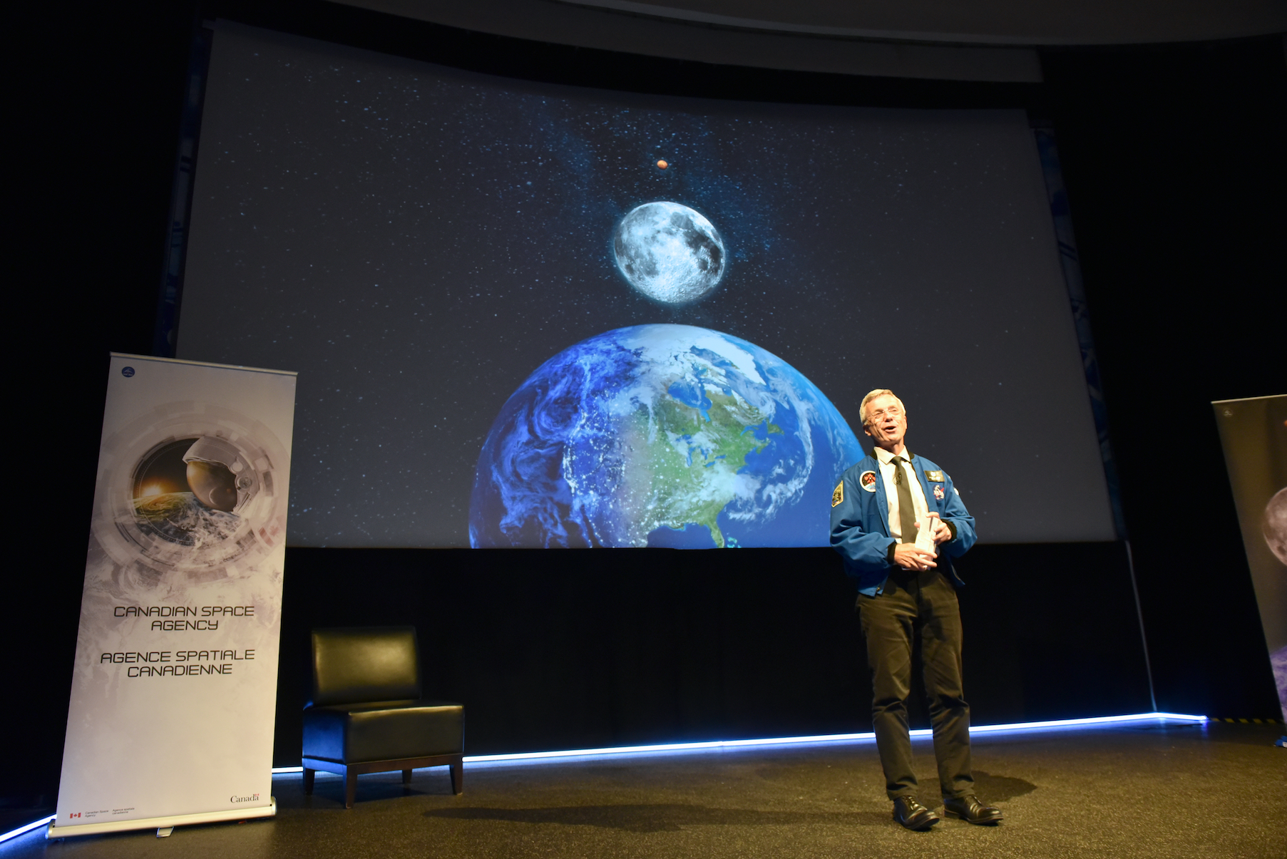 CSA astronauts David Saint-Jacques (at the Montreal Science Centre) and Robert Thirsk (at the Ontario Science Centre) connected by video link to discuss the proud history and unfolding future of lunar exploration. (Credit: Canadian Space Agency)