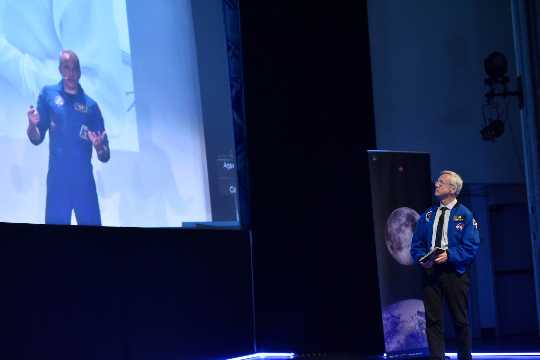 CSA astronauts David Saint-Jacques (at the Montreal Science Centre) and Robert Thirsk (at the Ontario Science Centre) connected by video link to discuss the proud history and unfolding future of lunar exploration. (Credit: Canadian Space Agency)