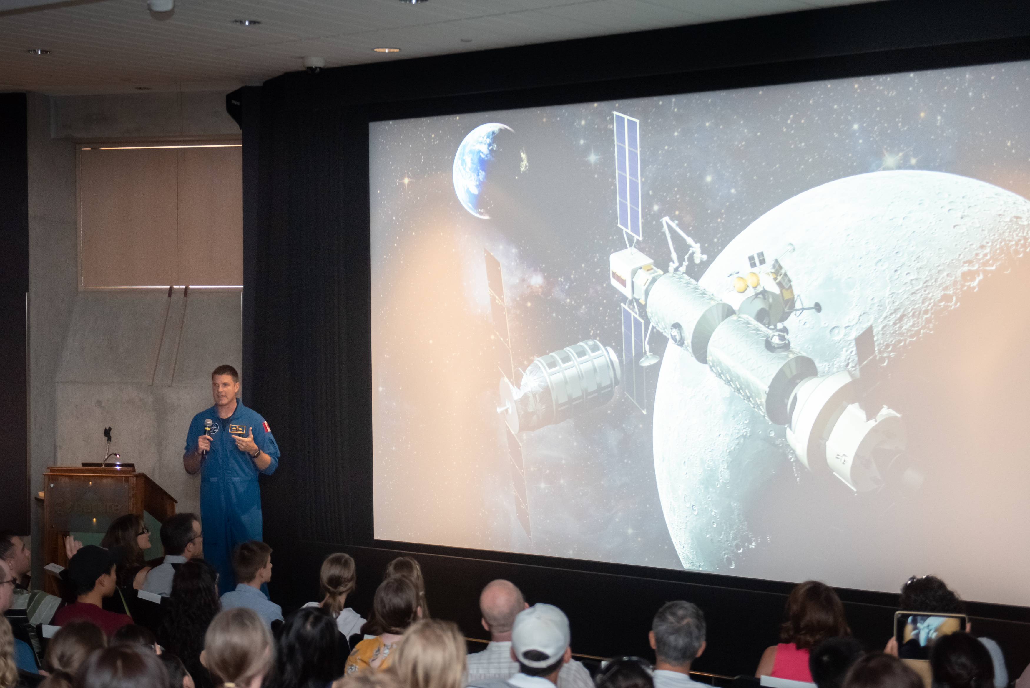 CSA astronaut Jeremy Hansen hosted the local event at the Canadian Museum of Nature in Ottawa as David Saint-Jacques and Robert Thirsk connected by video link to discuss the proud history and unfolding future of lunar exploration. (Credit: Canadian Space Agency)