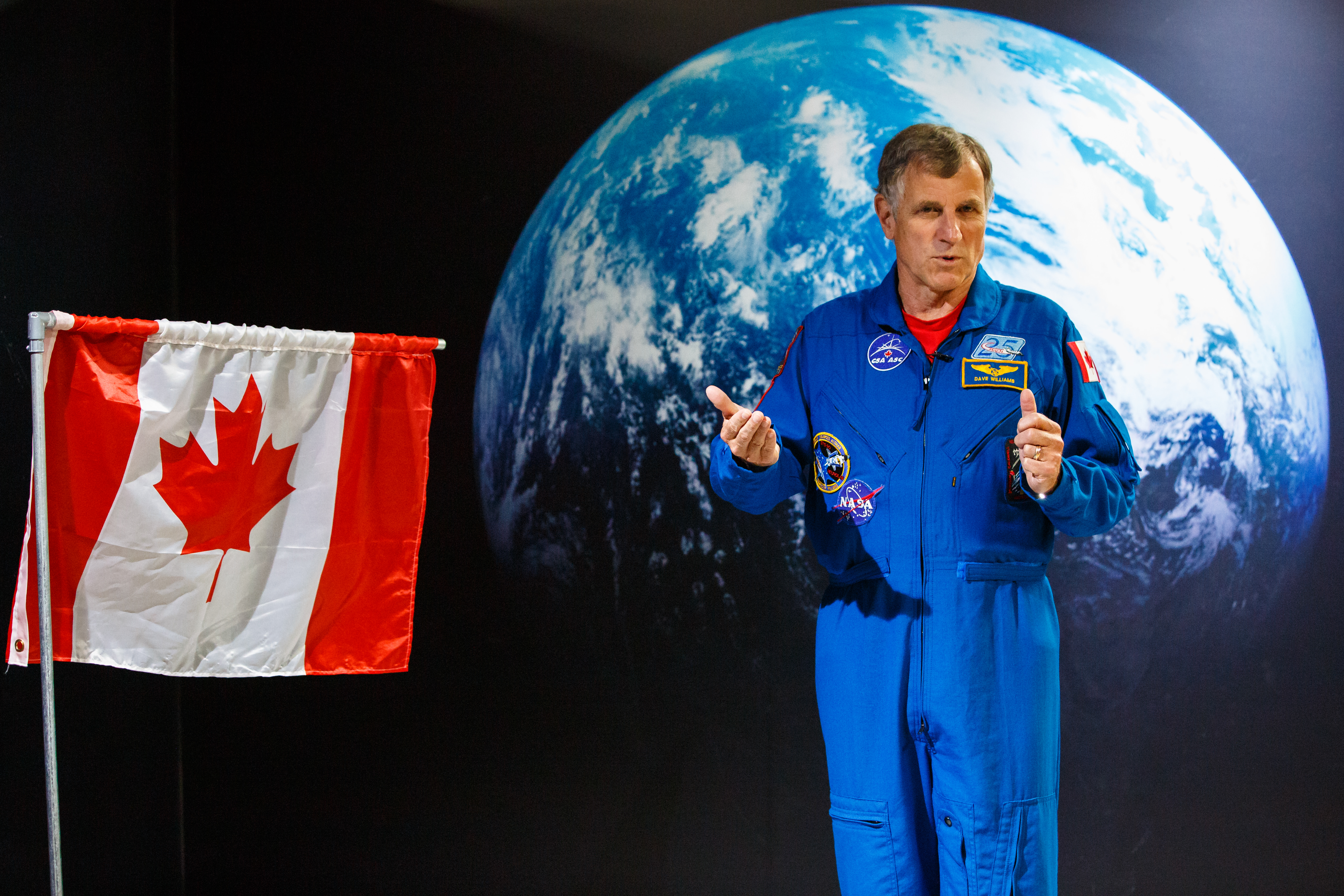 CSA astronaut Dave Williams hosted the local event at the Saskatchewan Science Centre in Regina as David Saint-Jacques and Robert Thirsk connected by video link to discuss the proud history and unfolding future of lunar exploration. (Credit: Canadian Space Agency)