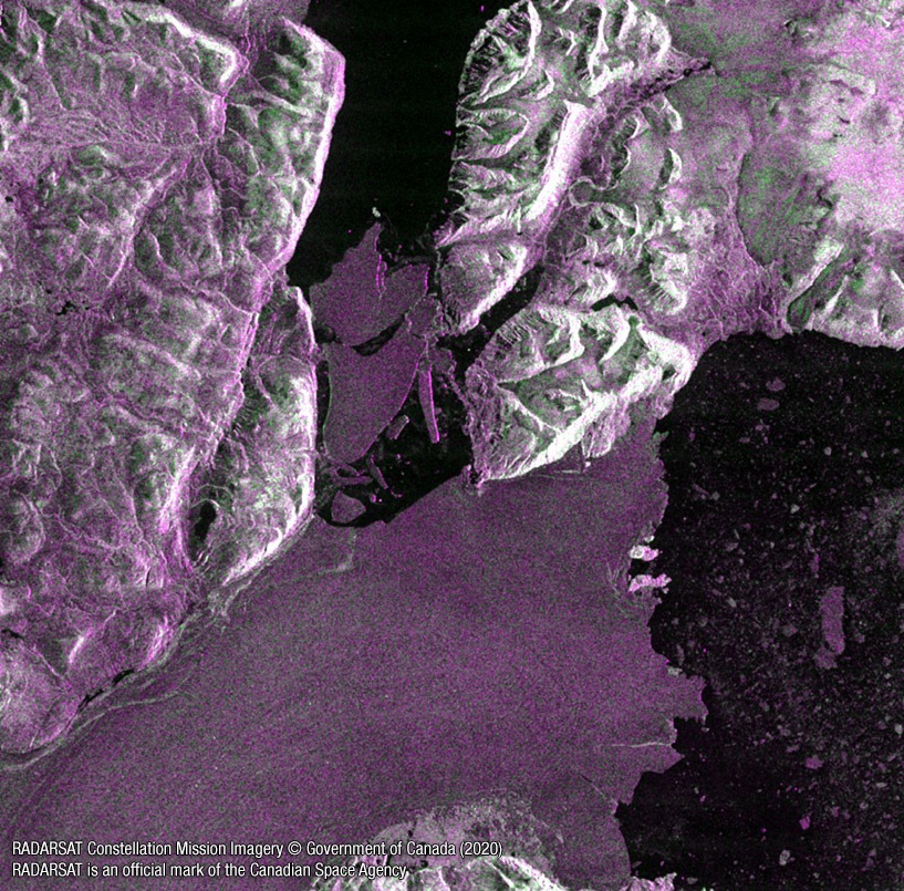 Image of Greenland’s Spalte Glacier taken by the RADARSAT Constellation Mission satellites on August 28, 2020. (Credit: RADARSAT Constellation Mission product © Government of Canada, 2020 – All rights reserved. RADARSAT is an official trademark of the Canadian Space Agency)