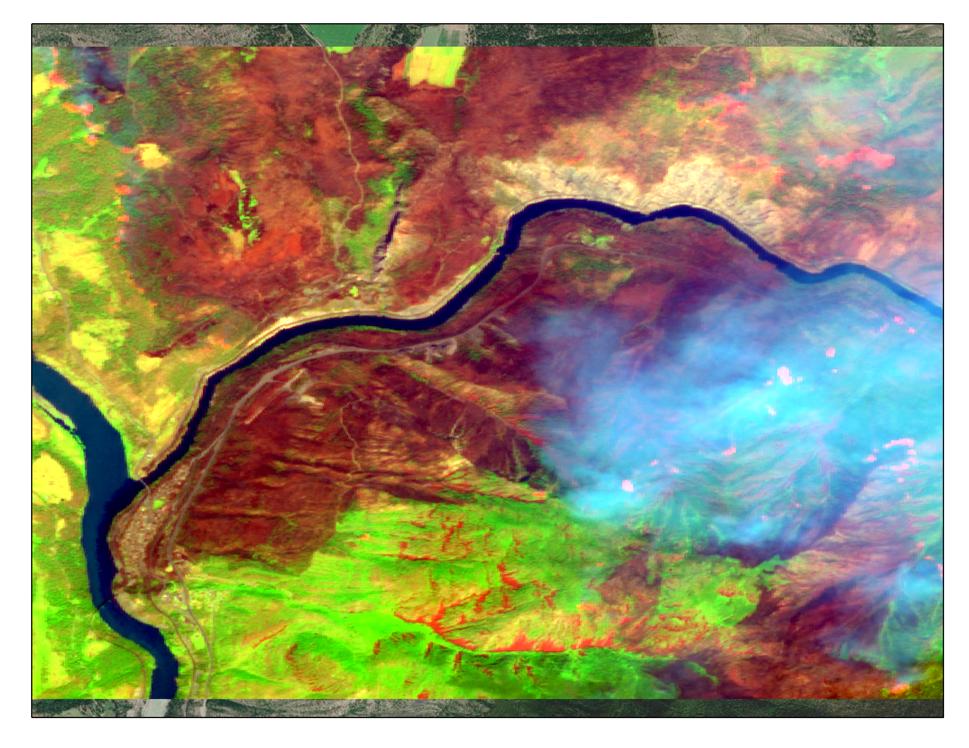 This Sentinel-2 satellite image shows the area of Lytton, British Columbia, on July 1, after the fire. The industry is using shortwave infrared to see through the smoke and detect the dark burn scar and active fire front.