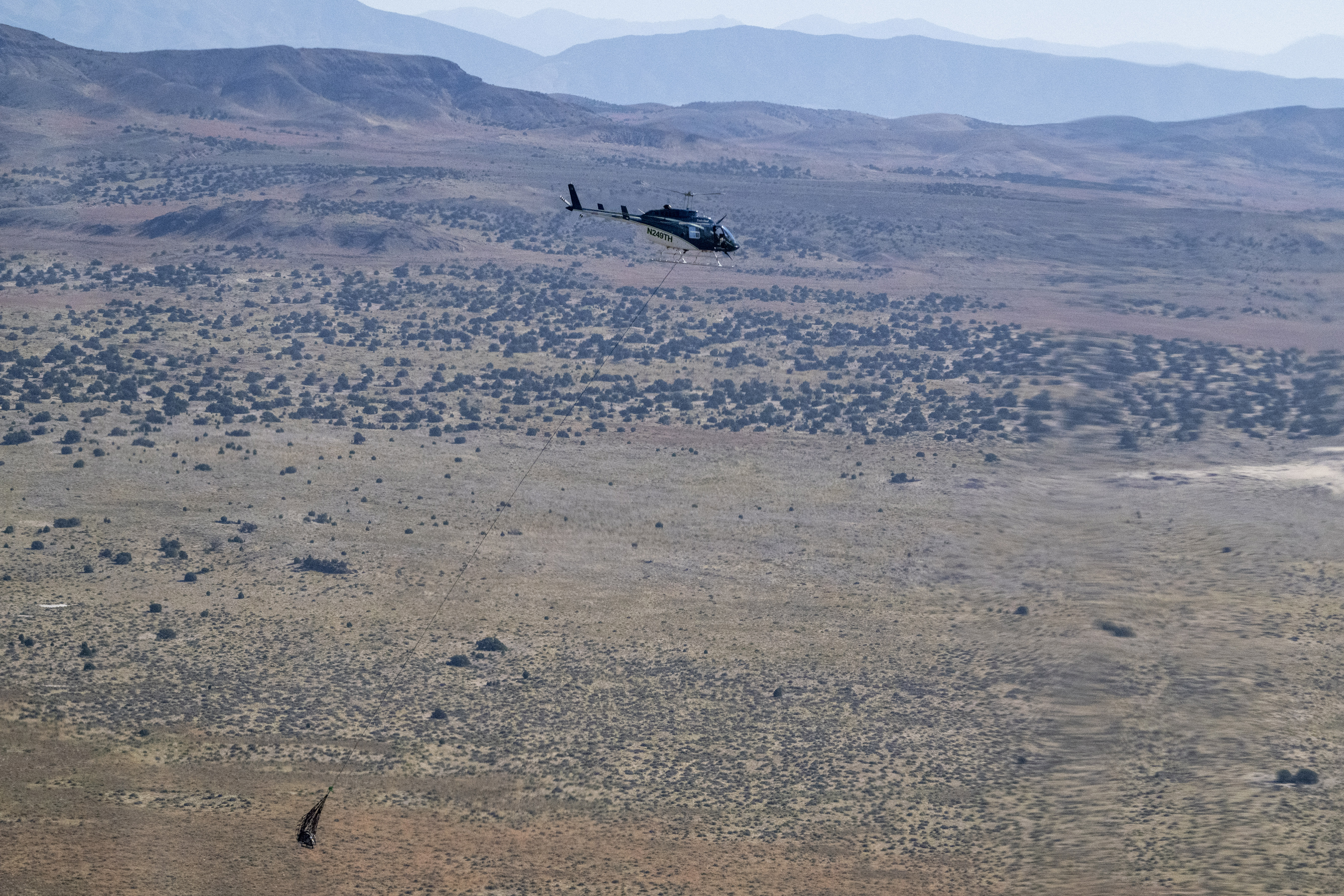 The sample return capsule from the OSIRIS-REx mission is transported by helicopter to the cleanroom, after its landing on September 24, 2023. (Credit: NASA/Keegan Barber)