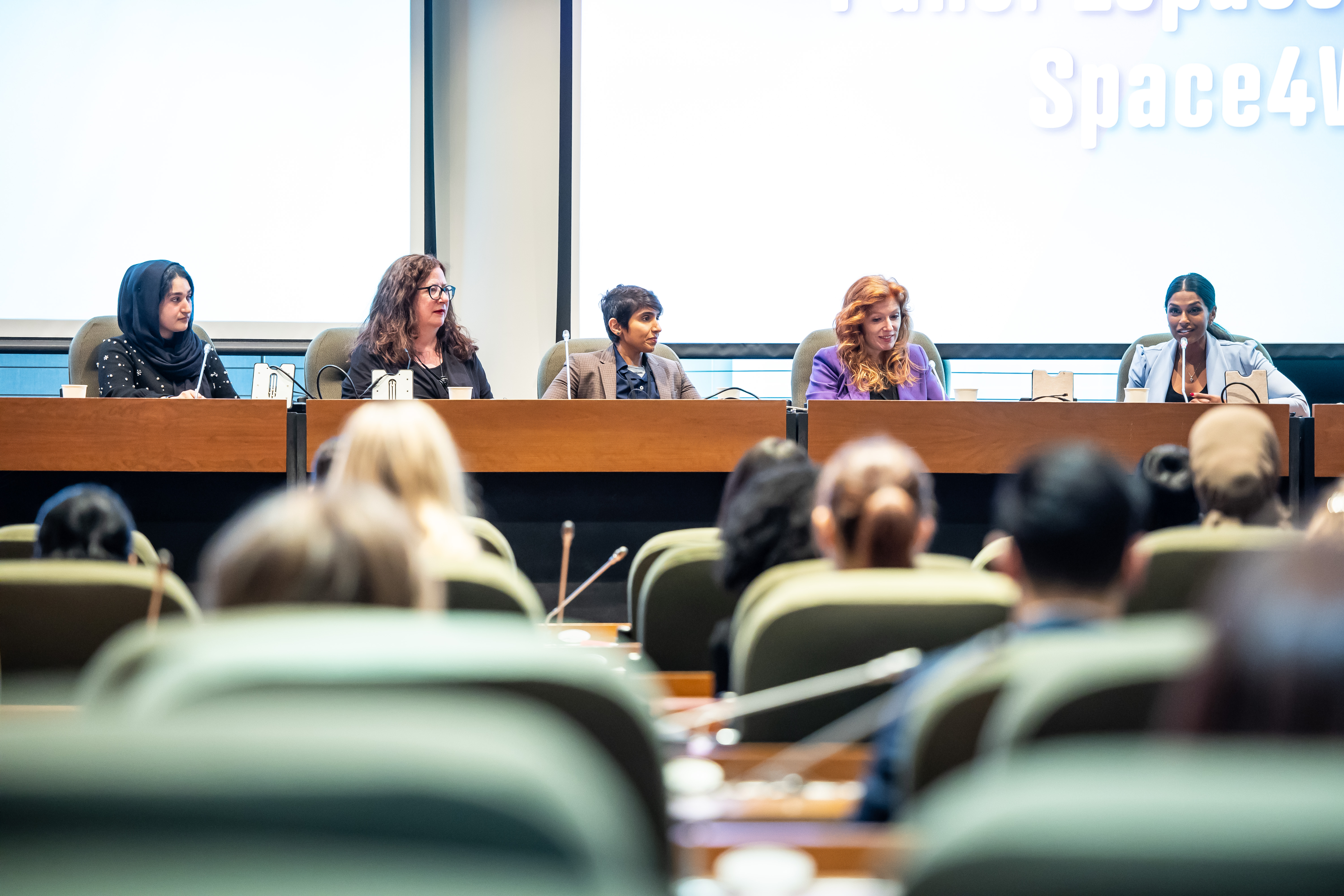 Global space community expert panel, (left to right) Zainab Azim, Alice Gorman, Mishaal Ashemimry, Veronica Cesco et Kumudu Jinadasa, at the Space4Women expert meeting. (Credit: Canadian Space Agency)