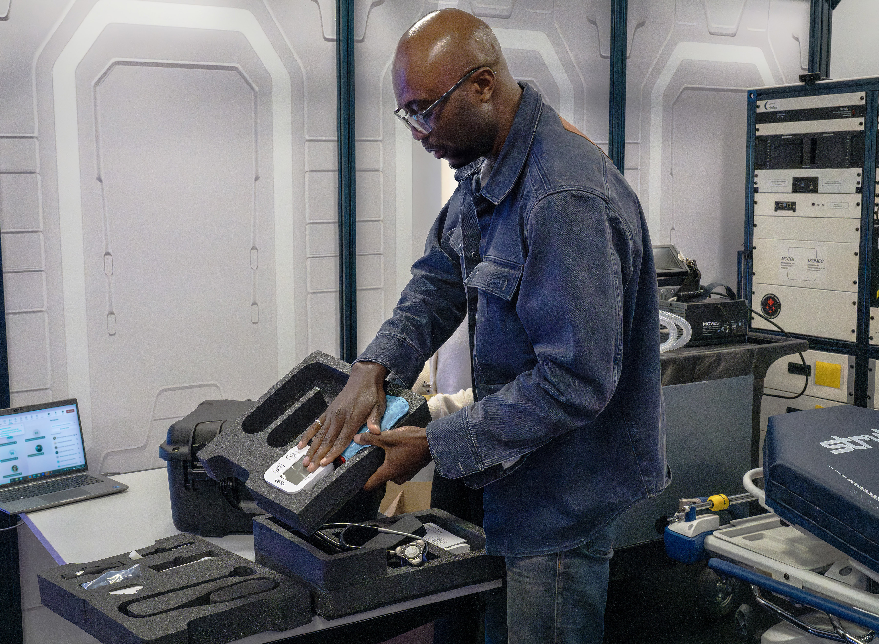The CSA's Connected Care Medical Modules (C2M2) initiative encourages the development of technologies that will enable astronauts to monitor their health and handle their medical issues in a more autonomous fashion while they are far from Earth. A Baüne team member demonstrates the Routine, Emergency, Assessment, Care, Treatment (REACTTM) system. REACT is a portable medical system that integrates artificial intelligence and data from various devices to diagnose conditions, manage emergencies, and provide personalized treatment recommendations, designed for space missions and remote healthcare on Earth. (Credit: Canadian Space Agency)