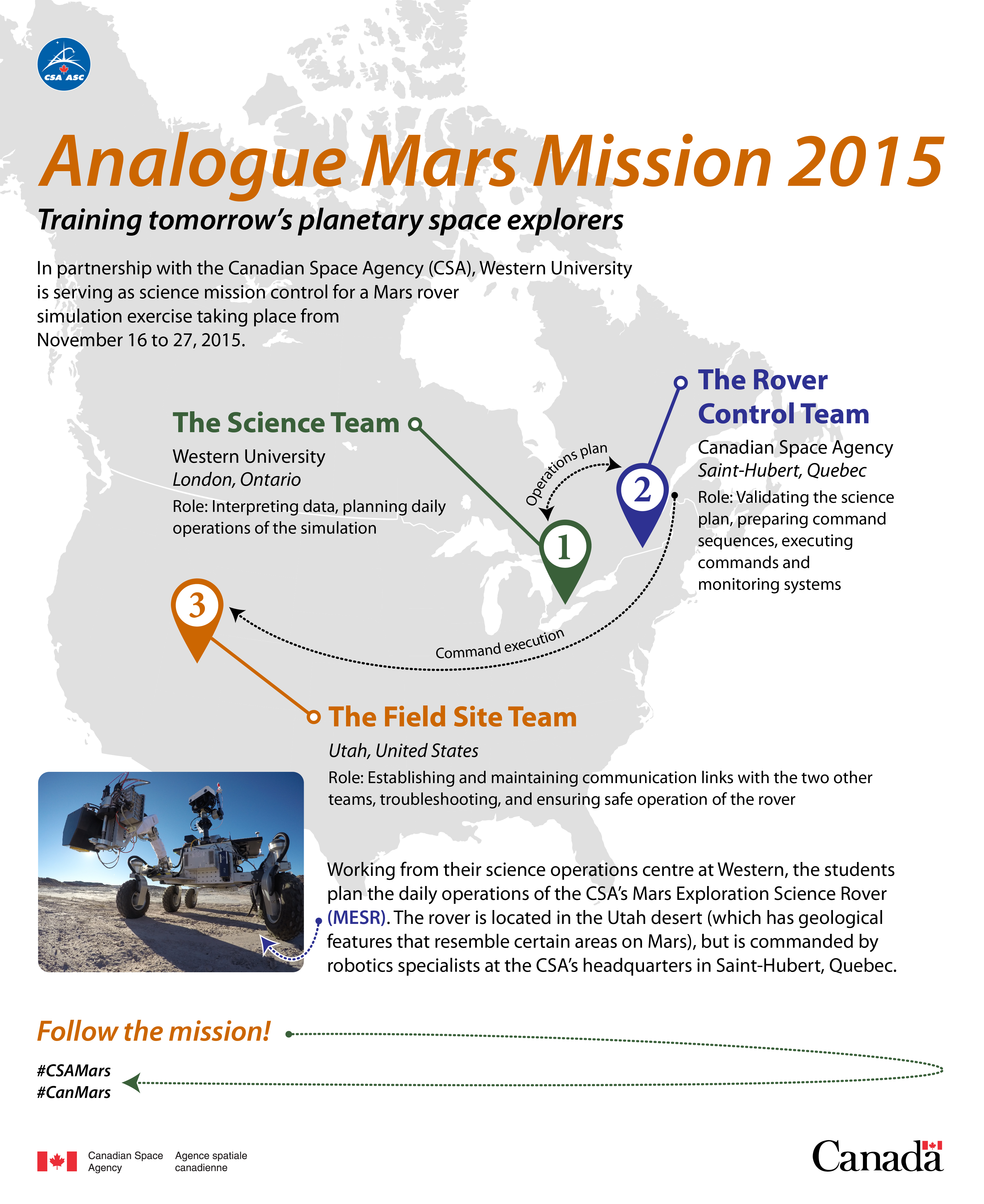 2015-11-16 - Illustration presenting the roles of the three teams participating in the Analogue Mars Mission from three different sites: Western University (London, Ontario), the Canadian Space Agency (Saint-Hubert, Quebec), and the Utah desert (United States). (Credit: Canadian Space Agency)