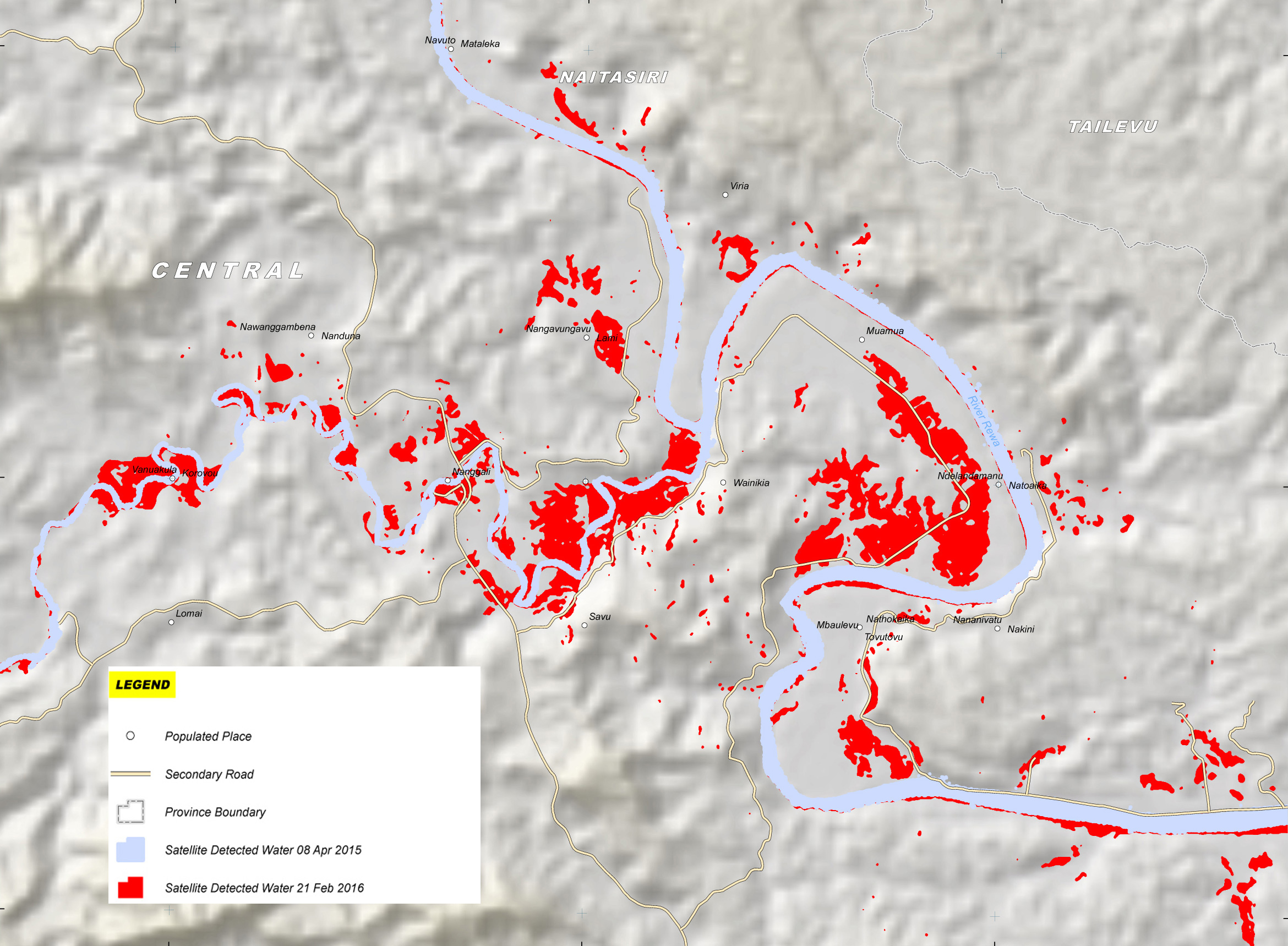 2016-02-21 - This map illustrates satellite-detected waters in Savu area, Naitasiri Province situated in the south of Viti Levu Island (Fiji). Using satellite imagery collected by RADARSAT-2 on 21 February 2016 and 08 April 2015, UNOSAT identified - 1,100 hectares of land to be potentially affected by waters. The map shows the provincial boundaries (dotted line), populated places (white dot), secondary roads (yellow line) and compares satellite detected water on April 8, 2015 (blue) to satellite detected water on February 21, 2016 (red). Most of the affected areas are agricultural fields located along the banks of River Rewa.