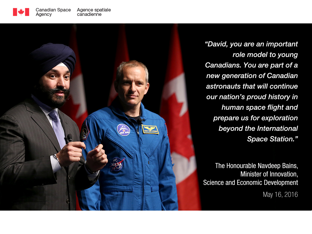 Text on illustration: "David, you are an important role model to young Canadians. You are part of a new generation of Canadian astronauts that will continue our nation's proud history in human space flight and prepare us for exploration beyond the International Space Station."