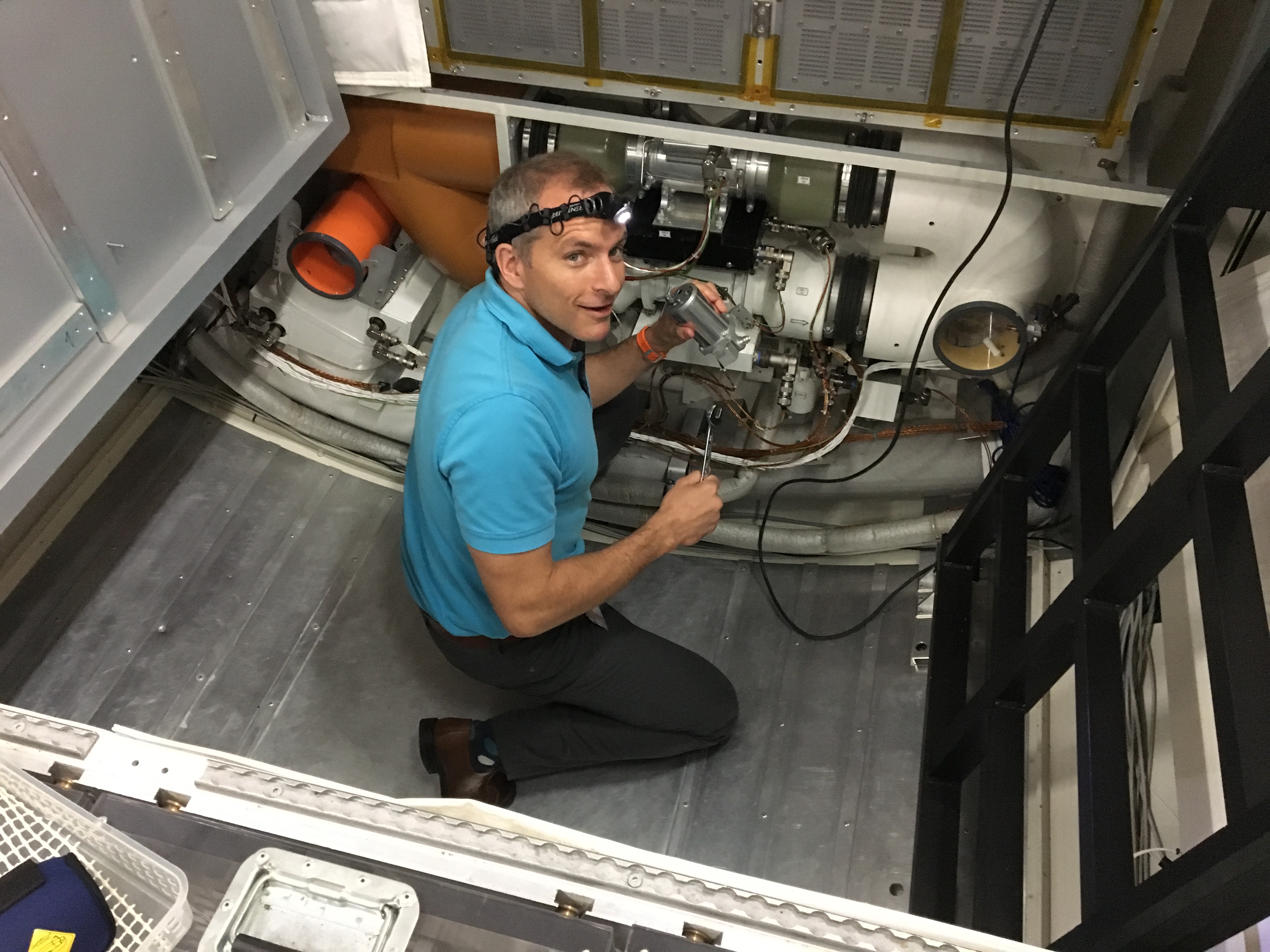 David learned how to repair the air conditioning system, one of the many tasks that astronauts need to be able to perform. (Credit: Canadian Space Agency)