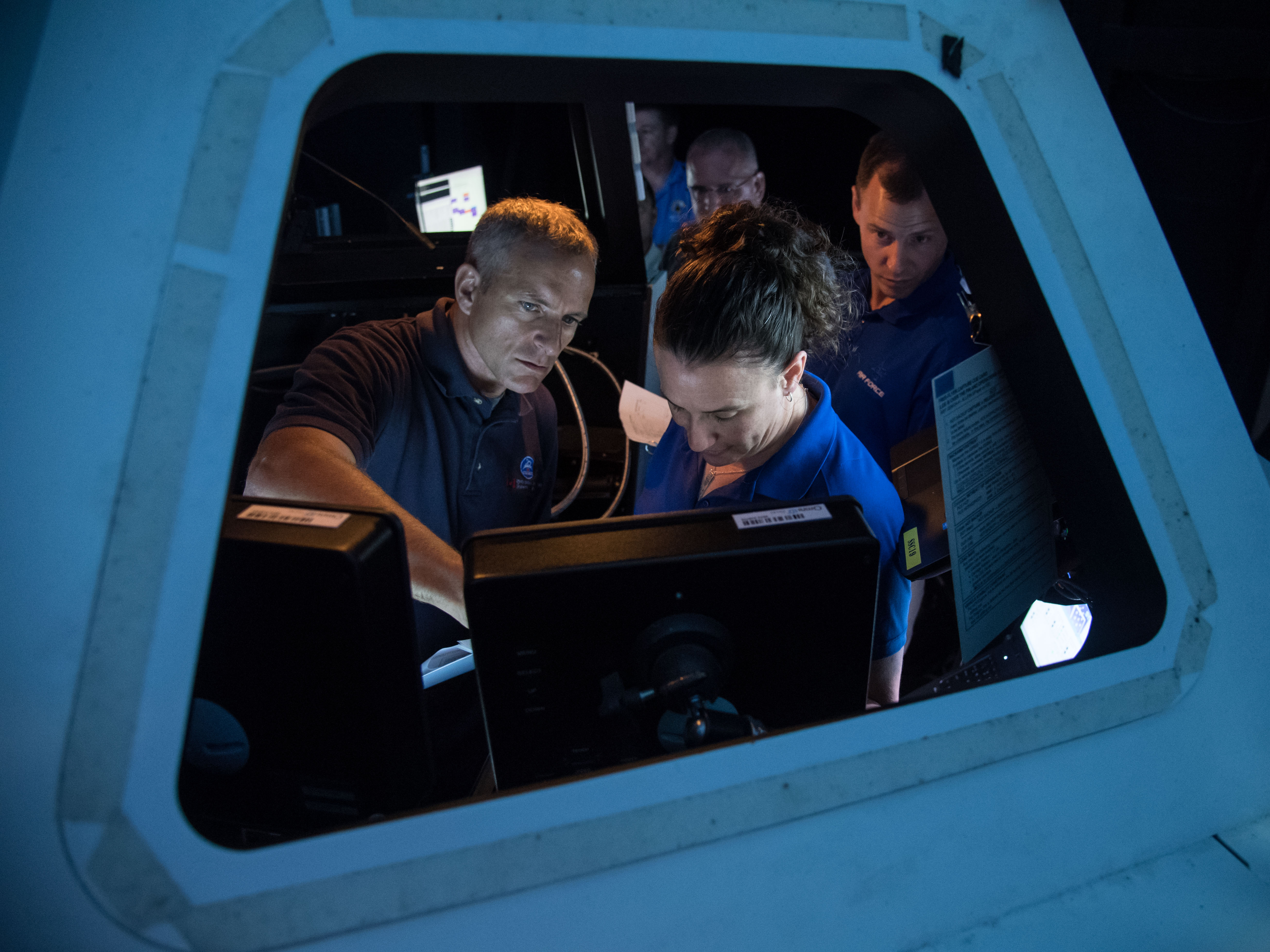 2017-09-25 – David Saint-Jacques and his colleagues Serena Auñón-Chancellor and Nick Hague of NASA practised capturing free-flyer spacecraft in the Johnson Space Center’s highly realistic simulator of the ISS Cupola robotics workstation. (Credit: NASA/James Blair)