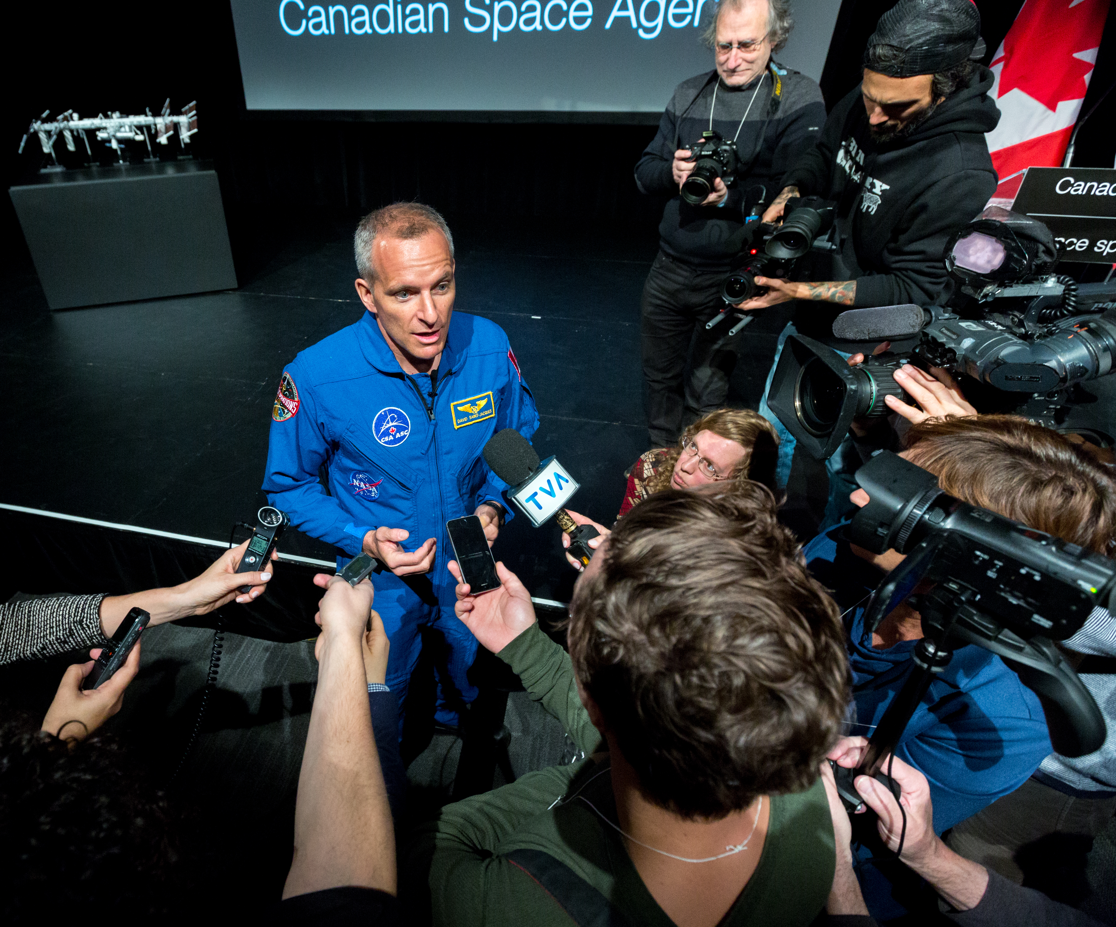 November 29, 2017, Longueuil, Quebec - Canadian Space Agency (CSA) astronaut David Saint-Jacques, joined by CSA President Sylvain Laporte, announced the Canadian health experiments to be conducted and the biotechnological devices that will be used during his mission to the International Space Station (ISS). (Credit: Canadian Space Agency)