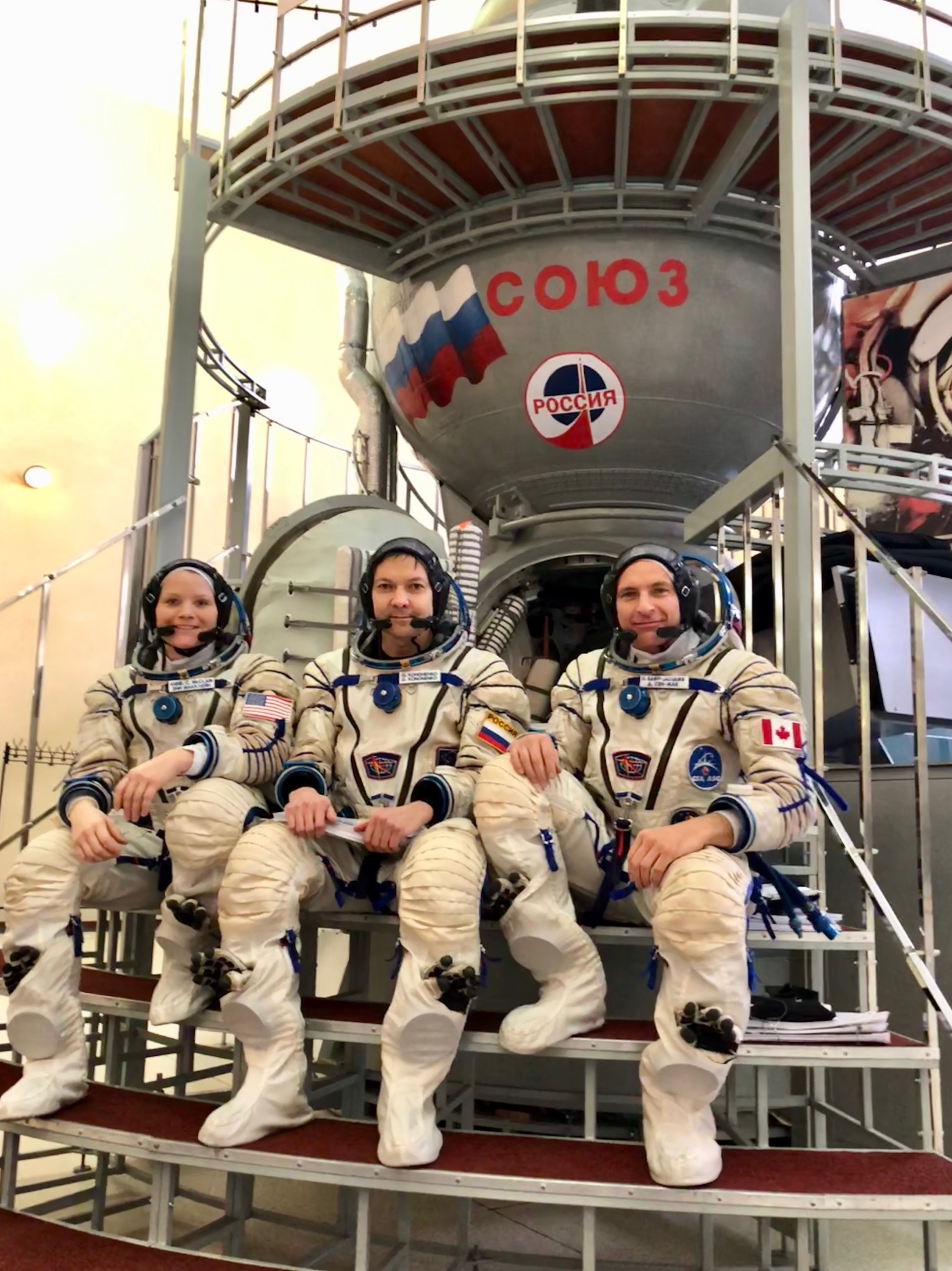 2018-01-29 - David Saint-Jacques and his crewmates Oleg Kononenko (Roscosmos) and Anne McClain (NASA) take training in the Soyuz simulator in Star City. (Credit: Canadian Space Agency)