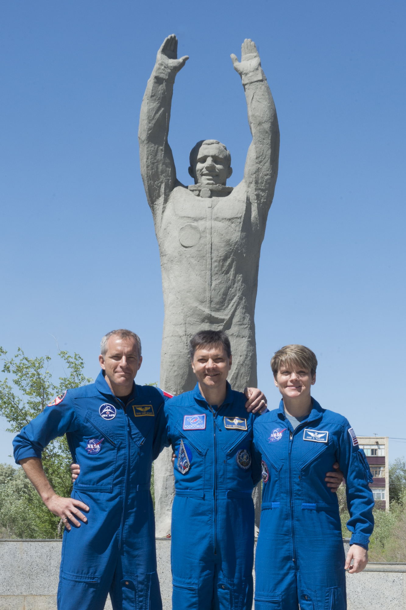 2018-05-21 – As a member of the backup crew for Expedition 56/57, David Saint-Jacques and his Expedition 58 crewmates, Oleg Kononenko (Roscosmos) and Anne C. McClain (NASA), take part in pre-launch activities with the prime crew in Baikonur, Kazakhstan.