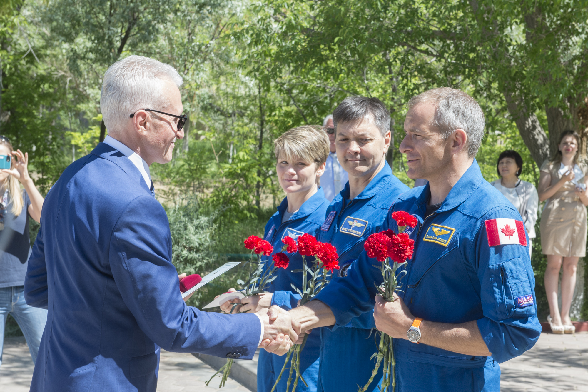 2018-05-21 – As a member of the backup crew for Expedition 56/57, David Saint-Jacques and his Expedition 58 crewmates, Oleg Kononenko (Roscosmos) and Anne C. McClain (NASA), take part in pre-launch activities with the prime crew in Baikonur, Kazakhstan. (Credit: Gagarin Cosmonaut Training Center (GCTC))