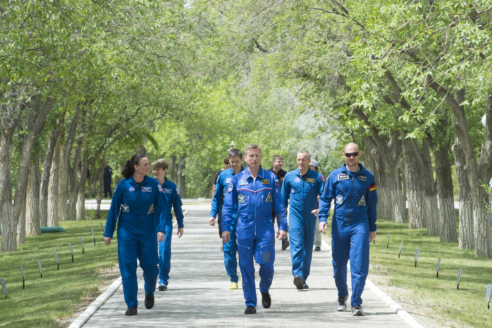 As a member of the backup crew for Expedition 56/57, David Saint-Jacques and his Expedition 58 crewmates, Oleg Kononenko (Roscosmos) and Anne C. McClain (NASA), take part in pre-launch activities with the prime crew in Baikonur, Kazakhstan.
