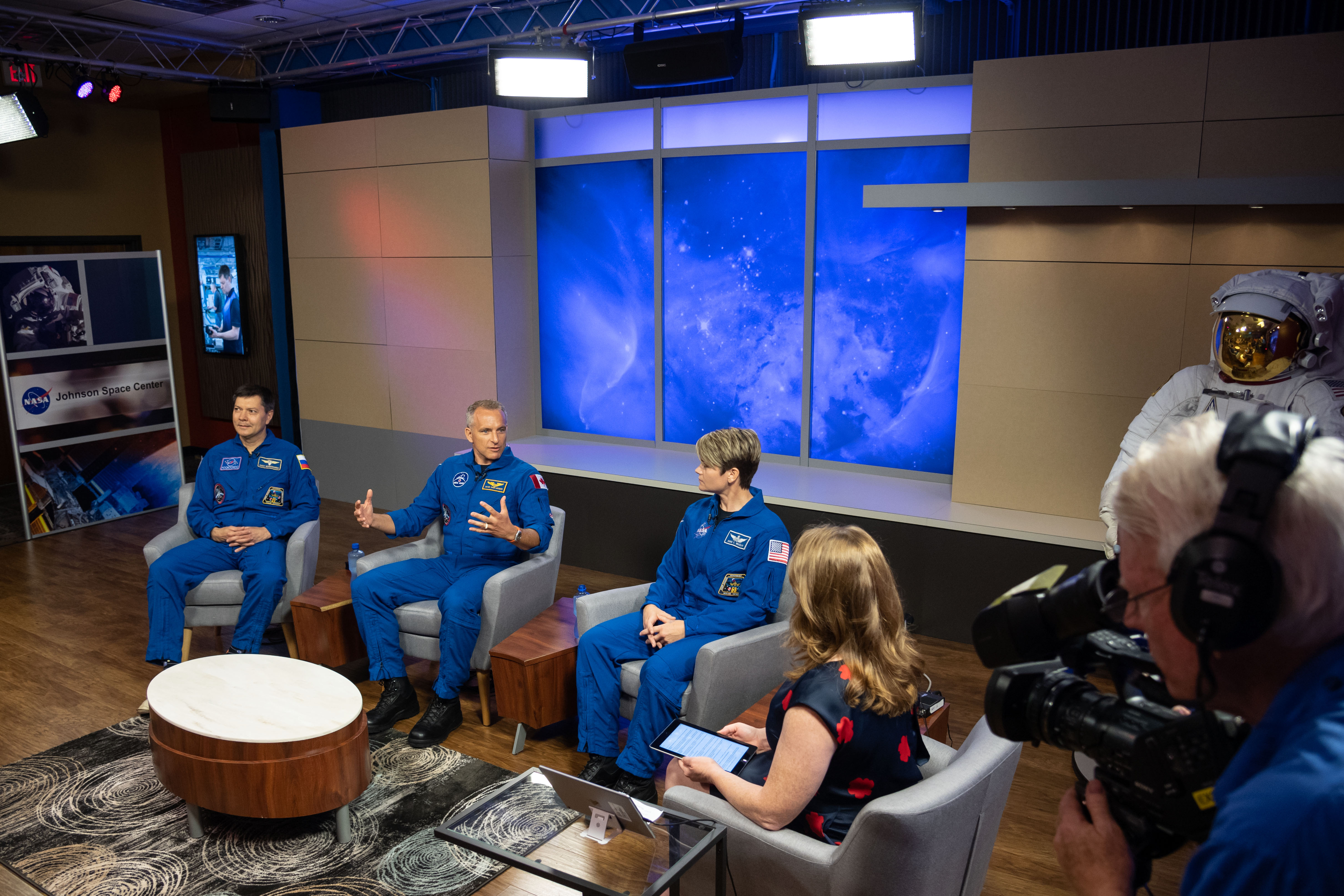 2018-09-06 - The Expedition 58/59 crew participate in a news conference at NASA's Johnson Space Center. Oleg Kononenko (Roscosmos), David Saint-Jacques (CSA) and Anne C. McClain (NASA) answer questions about their upcoming mission to the International Space Station. (Credit: NASA)