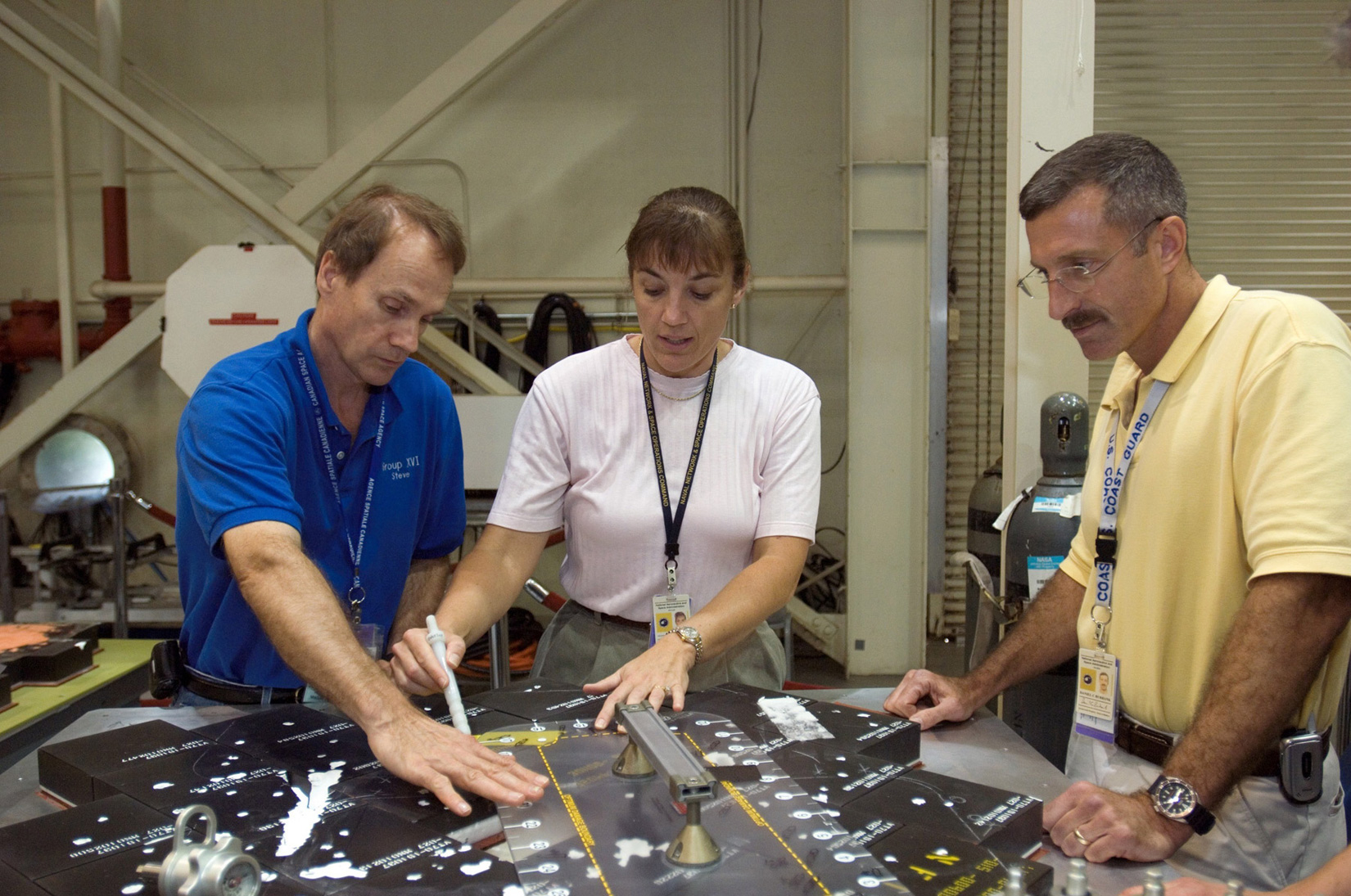 Les astronautes Steve MacLean (à gauche), Heidemarie Stefanyshyn-Piper et Daniel Burbank reçoivent une formation sur la réparation des tuiles thermoprotectrices de la navette spatiale dans le bâtiment des simulateurs d'engins spatiaux (SVMF) au Centre spatial Johnson. (Source : NASA.)