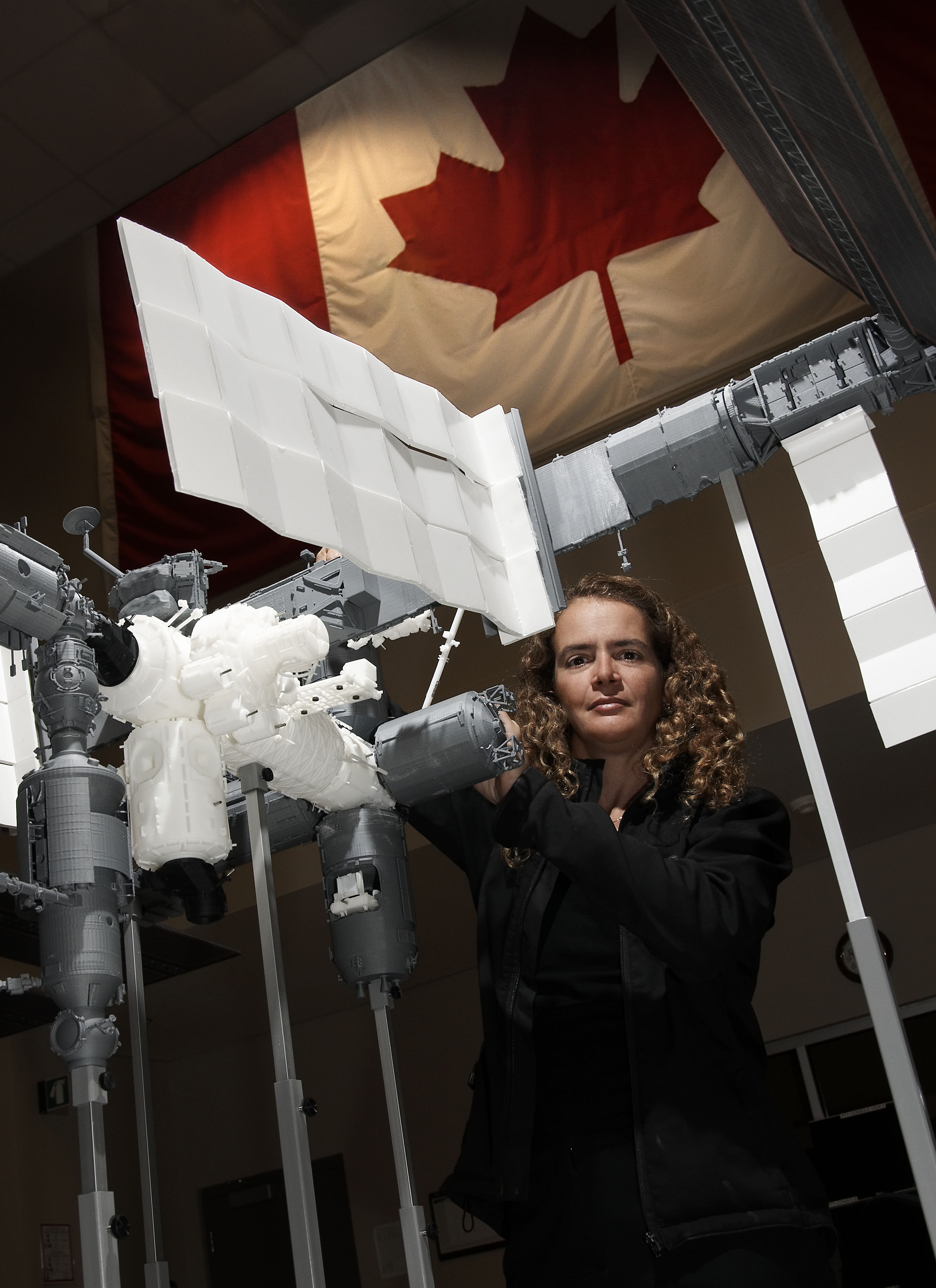 L’astronaute de l’Agence spatiale canadienne Julie Payette examinant une maquette de la Station spatiale internationale (ISS) au siège social de l’Agence à Saint-Hubert. (Source : .)