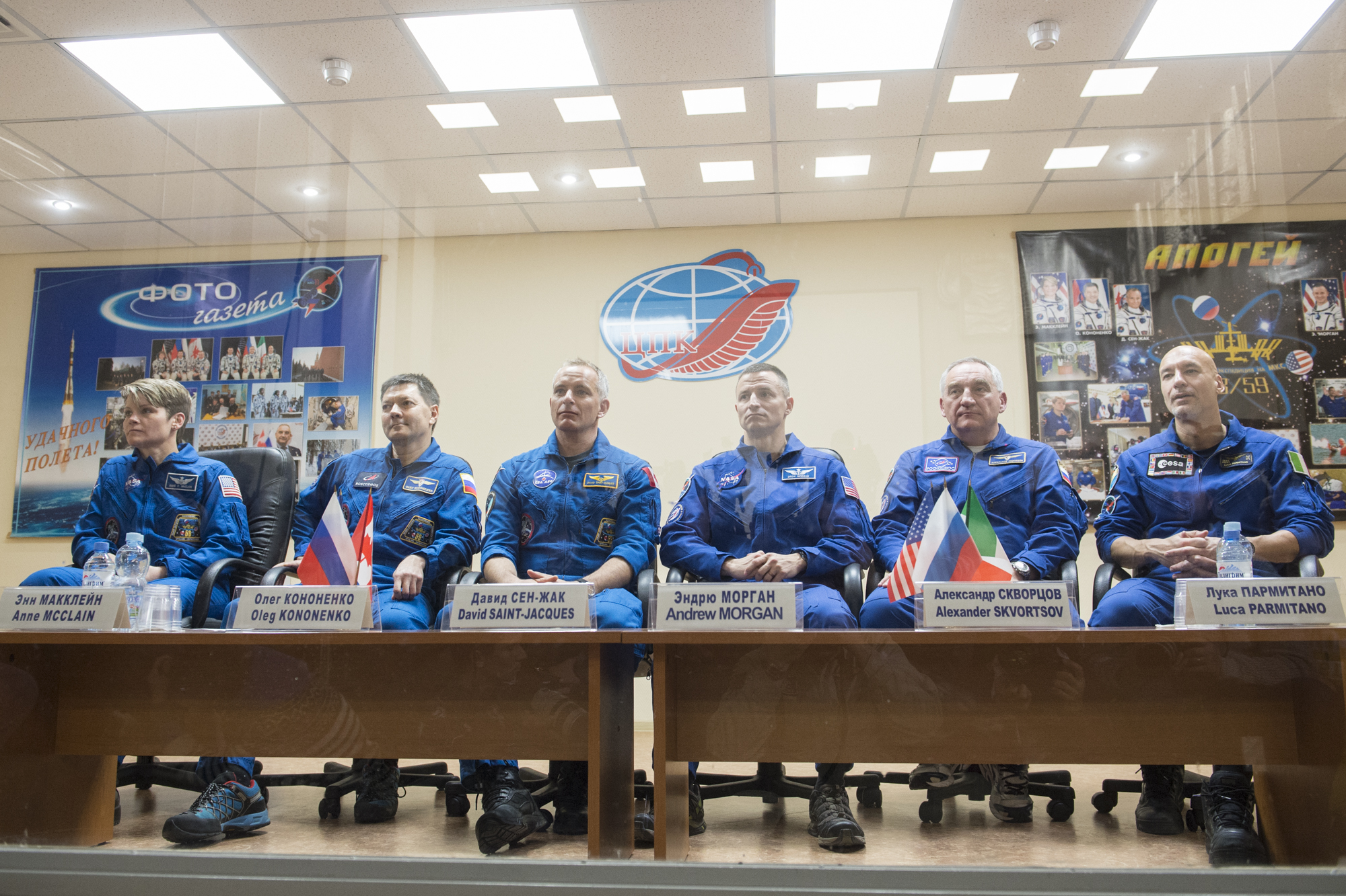 2018-12-02 – La veille du lancement, les astronautes de l’équipage principal et de celui de relève participent à la conférence de presse de l’équipage. (Source : Centre de formation des cosmonautes Youri-Gagarine (GCTC).)