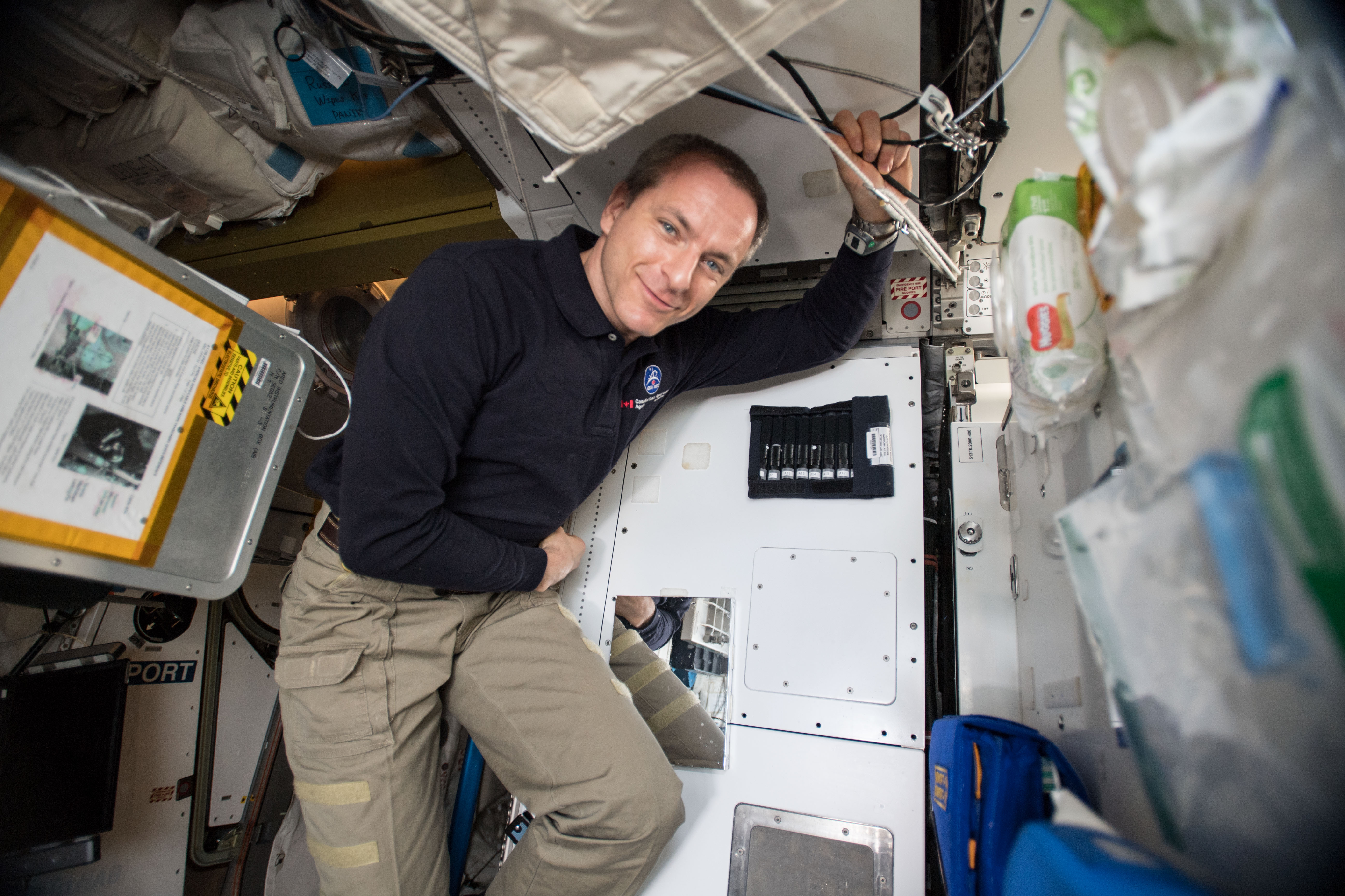2019-01-15 - David Saint-Jacques répartit en divers endroits de la Station les détecteurs à bulles de l'expérience canadienne Radi-N2 : ils visent à mesurer la dose de rayonnement neutronique auquel l'équipage est exposé. (Source : ASC/NASA.)